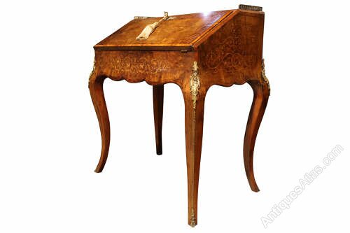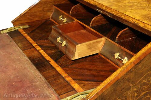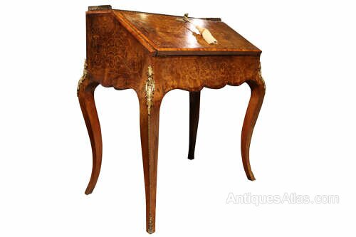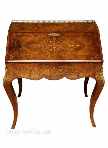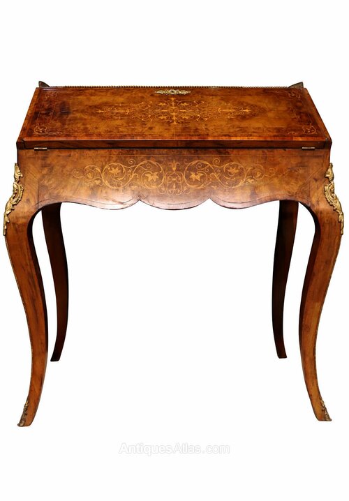 A fine late Victorian writing desk in walnut, beautifully inlaid with satinwood and enriched with elegant ormolu mounts. The desk is surmounted by a pierced brass gallery above a hinged fall-front, opening to reveal a well-fitted interior with drawers and a sliding writing surface.