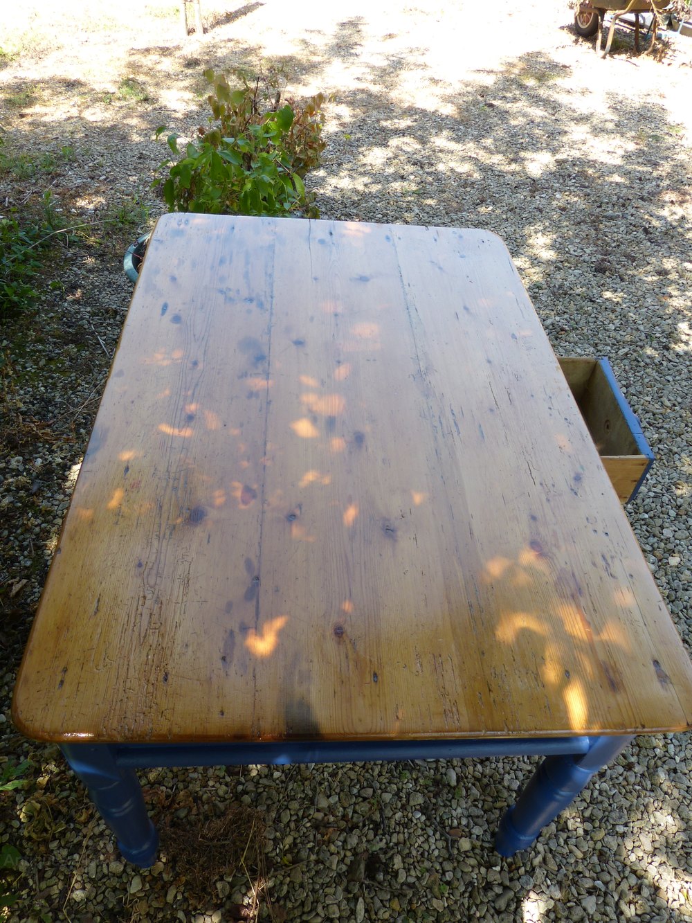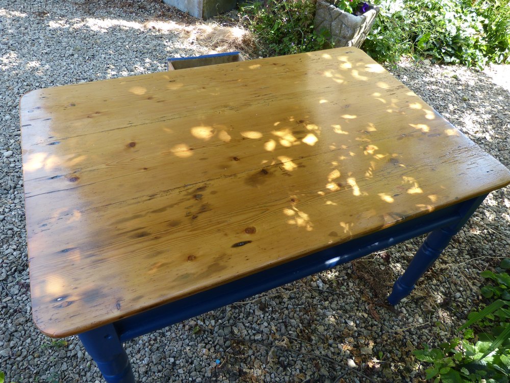 A Victorian, painted pine,kitchen table on turned supports and fitted with a single drawer. The base has been painted with Farrow and Ball:Drawing Room Blue. The top has been stripped and waxed.