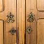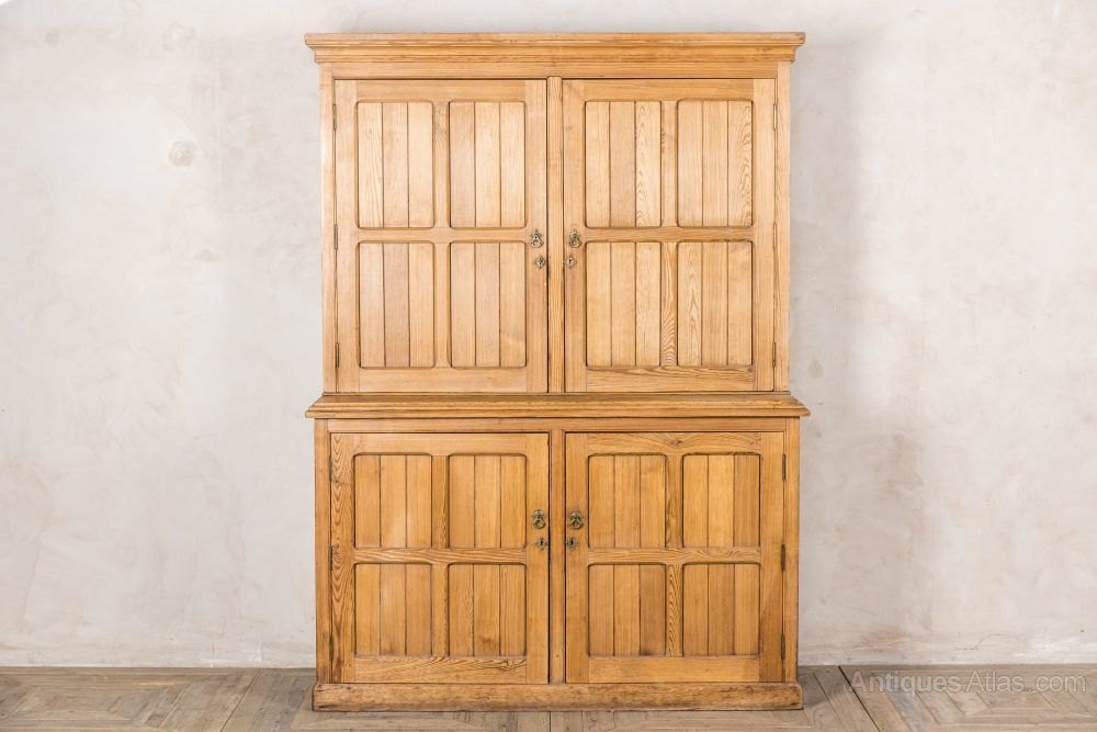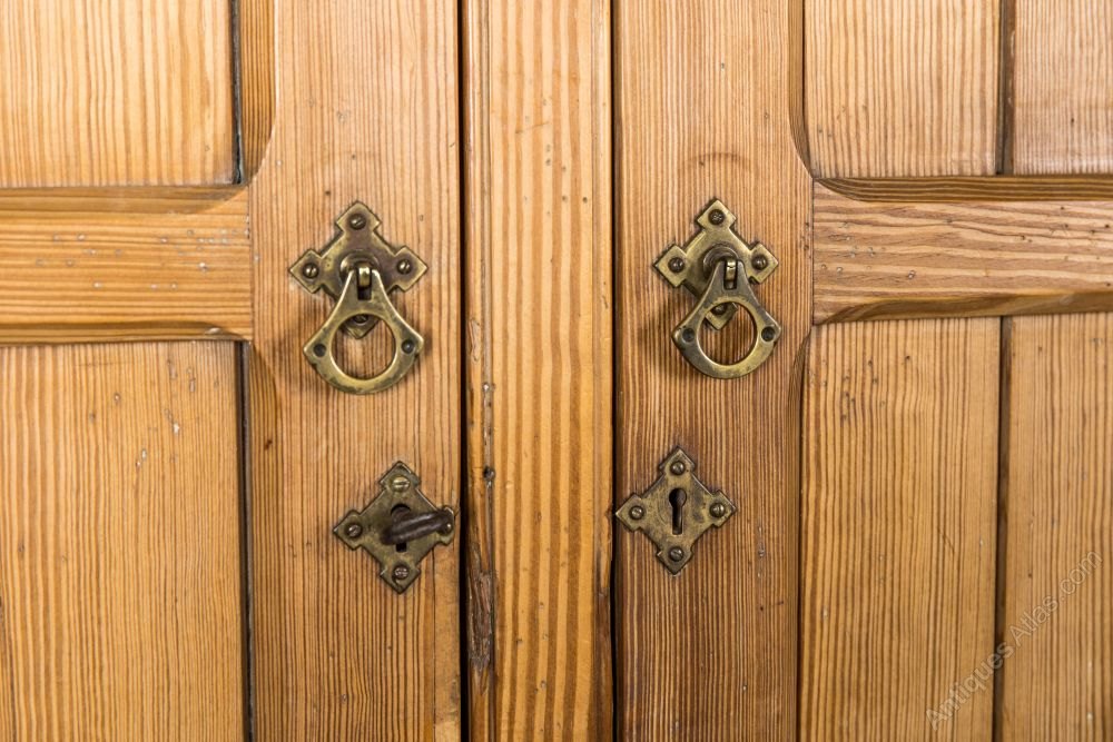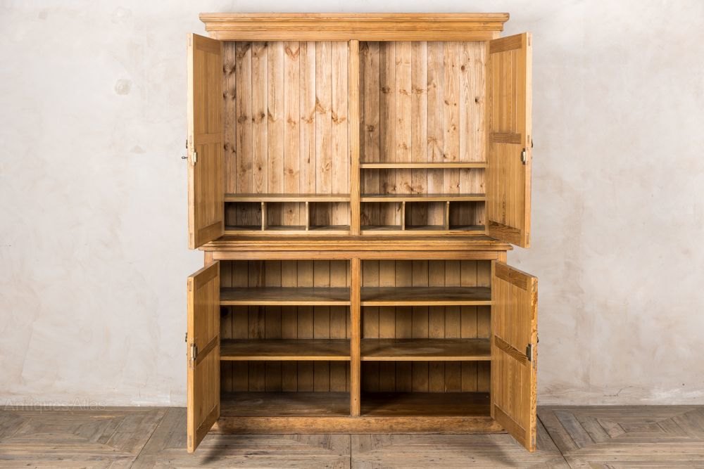 The Victorian cupboard has the original escutcheons and handles, adding even more authentic character to this piece of antique furniture. Wrapped in a beautiful worn natural pine colour, the cupboard splits into two for ease of transportation and reassembly.