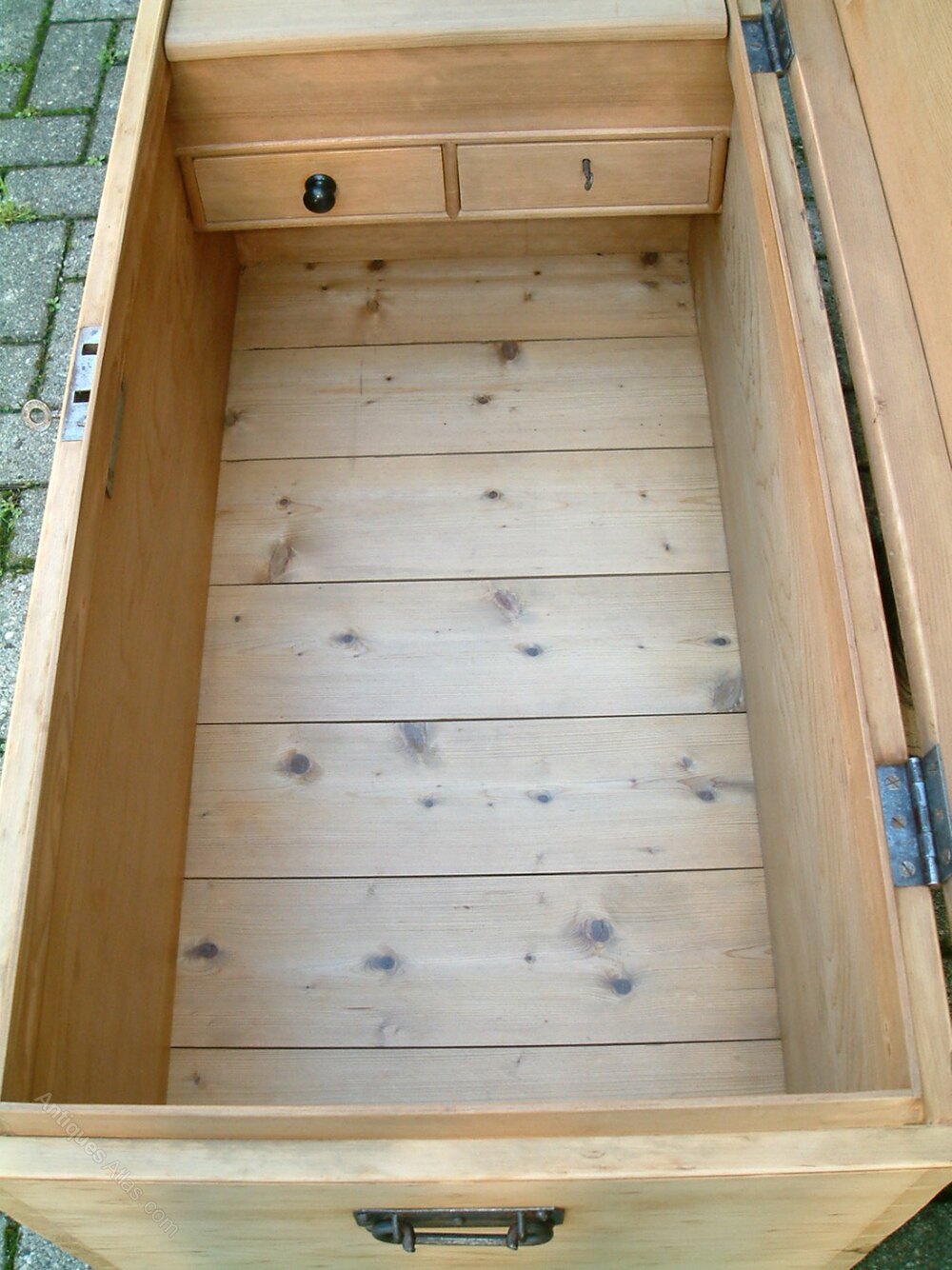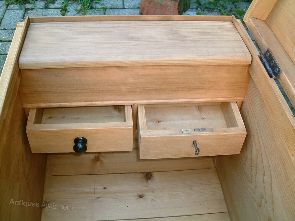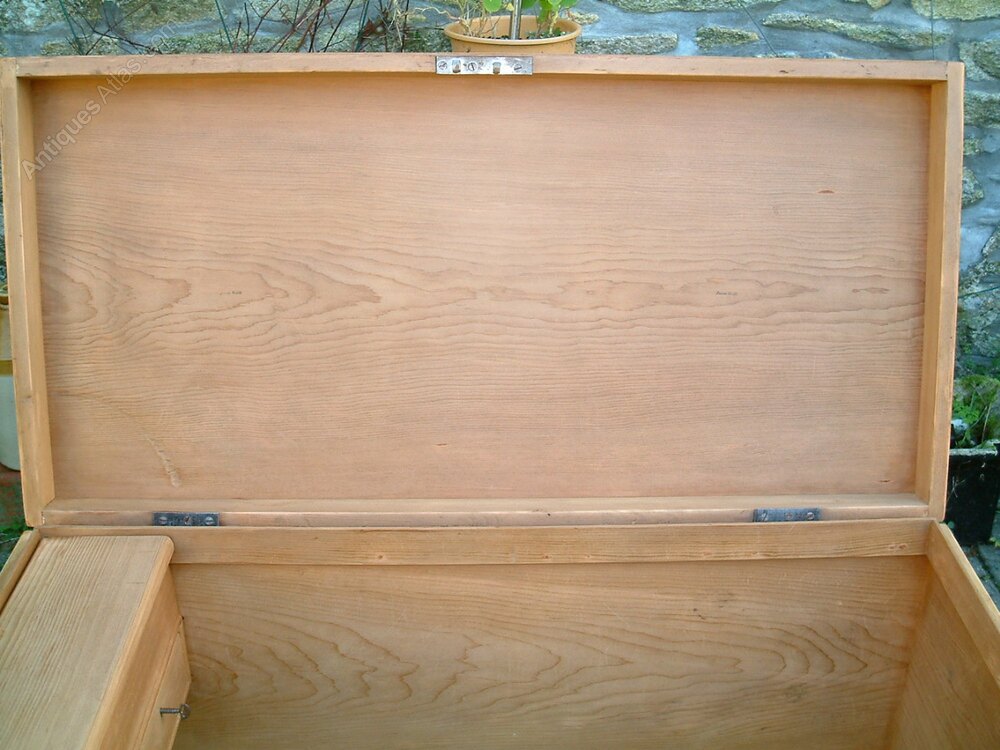 A superb, heavy, Victorian blanket box, on a plinth surround. The box is constructed from extremely wide unjointed boards, with dovetail construction. The interior has an excellent base and is fitted with a lift lid candle compartment and below two adjacent dovetailed drawers, one with lock and key fastening. The box also has the original lock with key. We are unable to guarantee the continued working of the locks and they can suffer from metal fatigue due to their age, however box locks normally don’t have a lot of use so may continue to work normally for years to come.