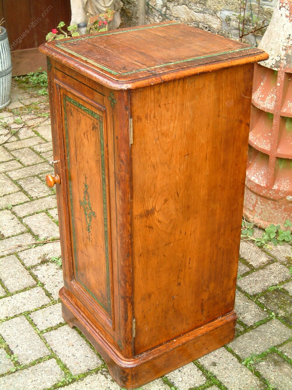 A beautiful, Mid Victorian pine pot cupboard on a shaped plinth surround. Internally fitted with a full depth shelf and enclosed by a panelled door, with replaced steel lock and key fastening. Original door knob. The cupboard retains it’s original shellac finish and painted decoration. There are numerous marks to the finish, but lovely to have the original paint. Photographed externally and may appear darker in an indoor setting. A superb piece of furniture