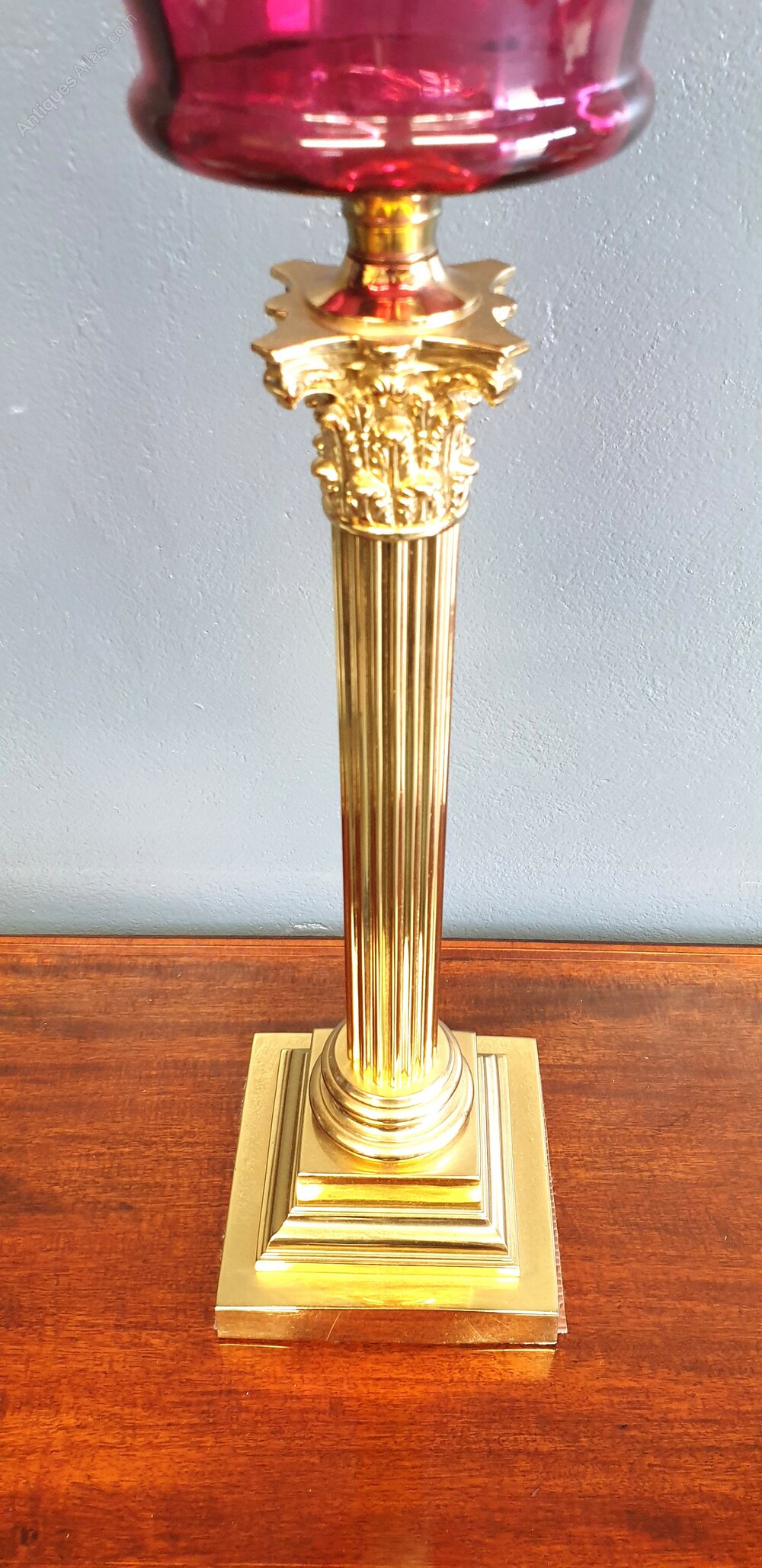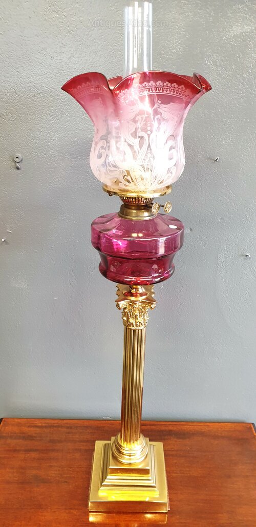 A superb antique Victorian ruby glass oil lamp having a Brass Corinthian Column & original acid etched shade.