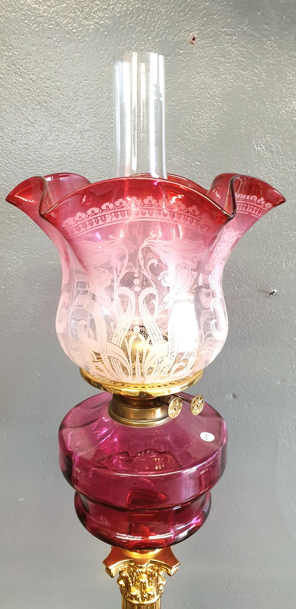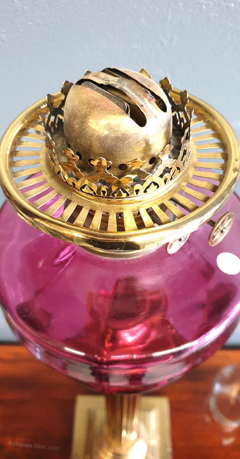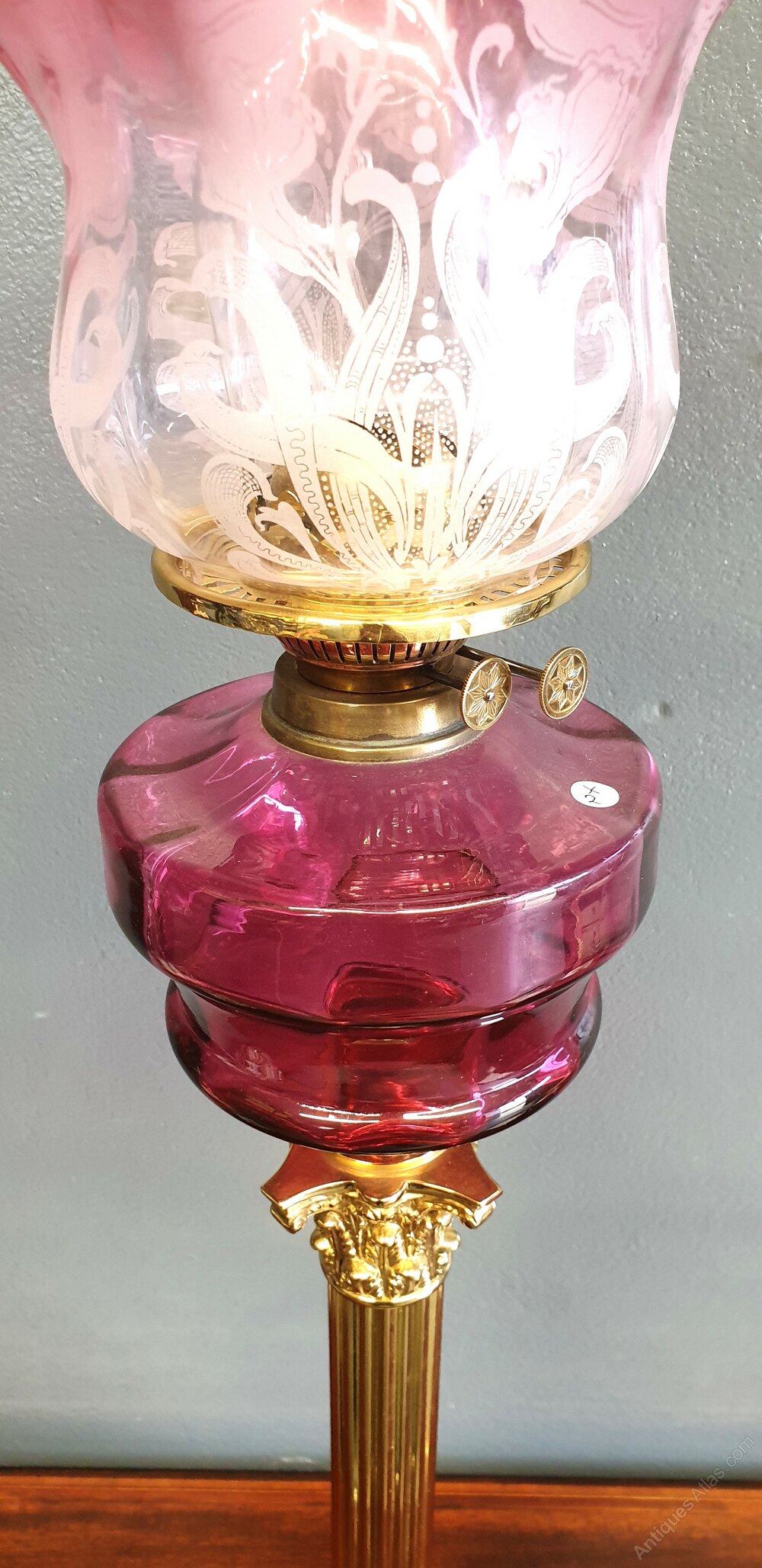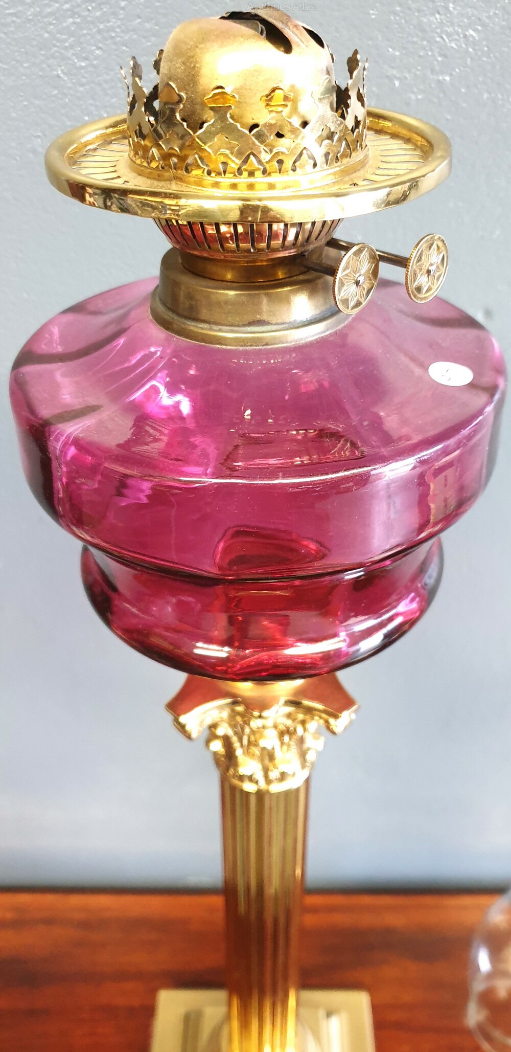Antique Cranberry Glass Oil Lamp on Brass Column
