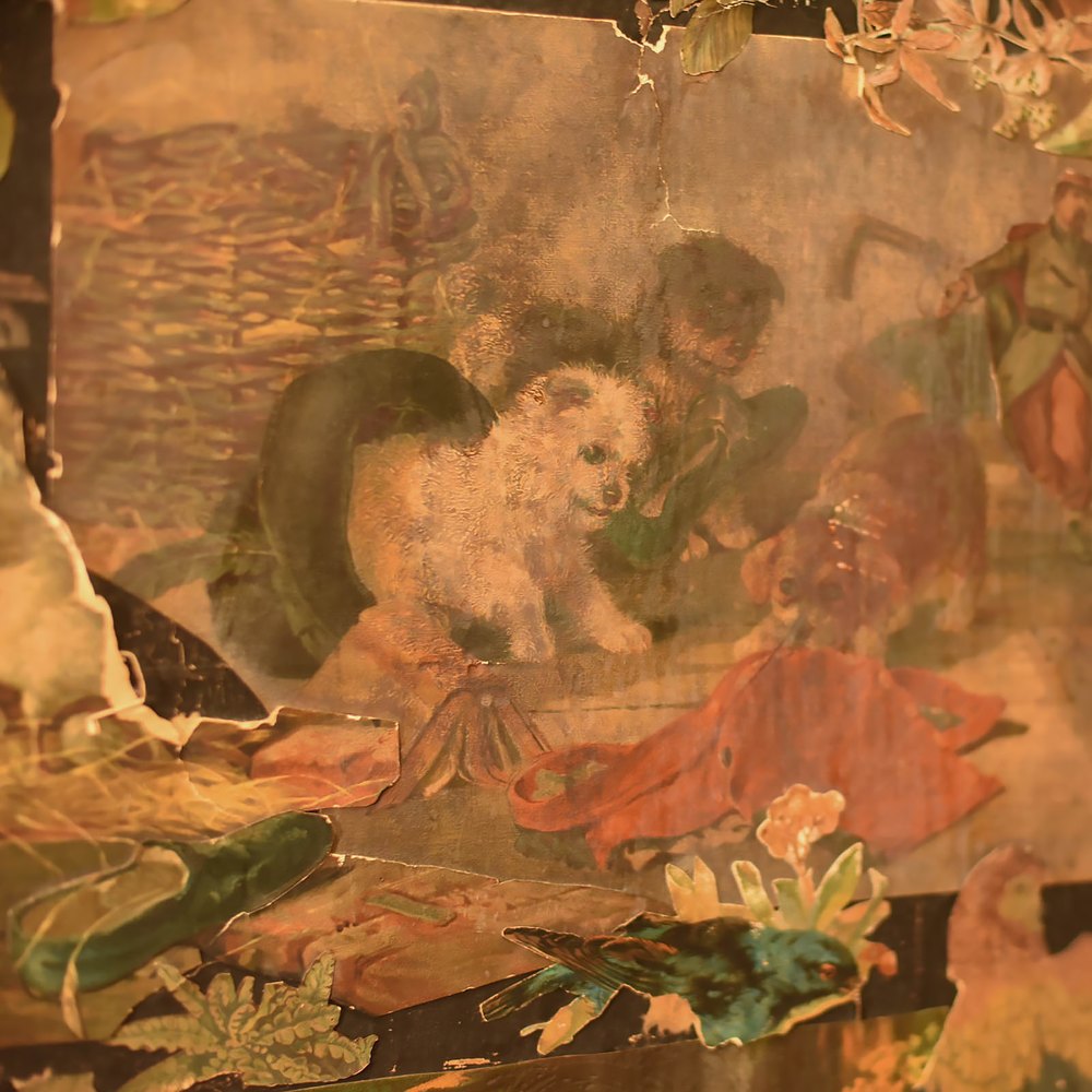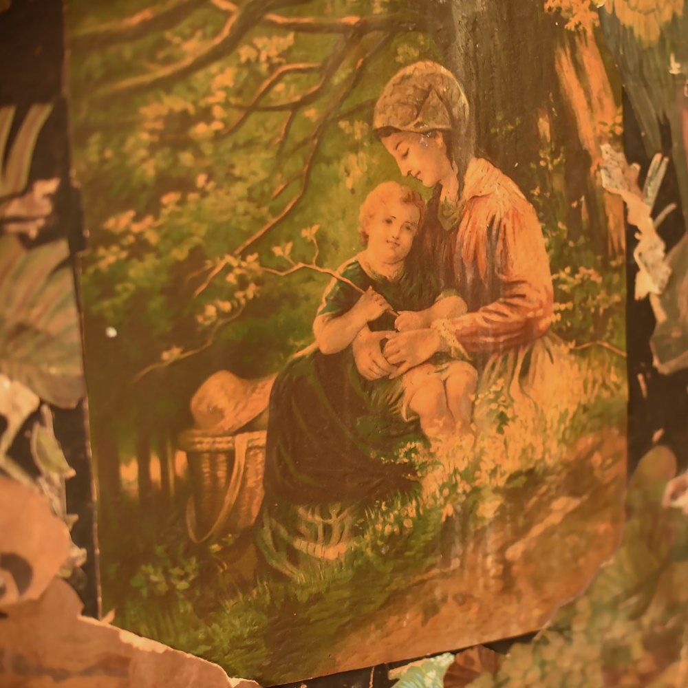 Double sided, one in colour the reverse in a patterned print, this découpage panel makes an excellent prop as well as serving well as a screen.