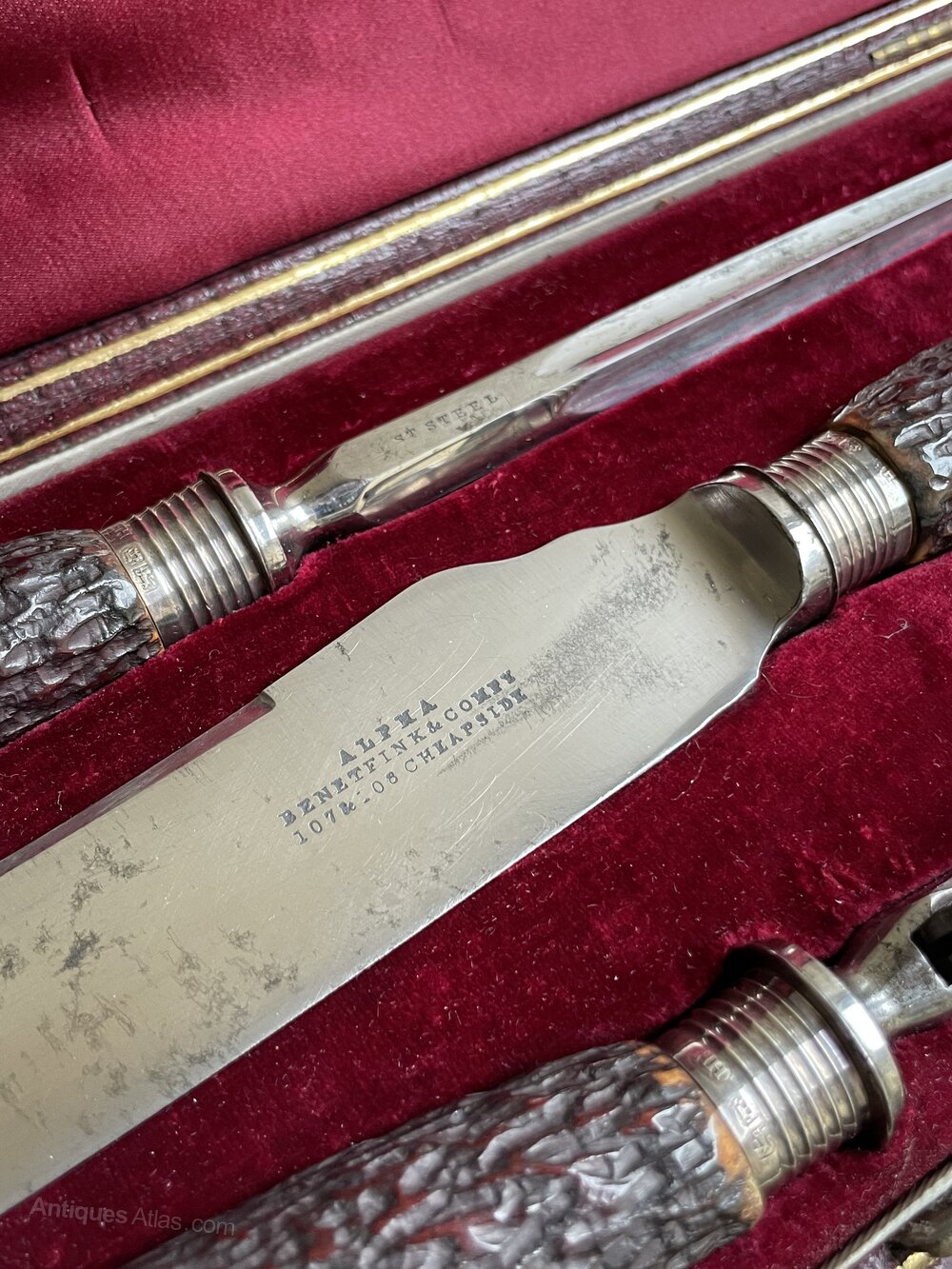 A super quality Victorian solid silver mounted three piece carving set retailed by Benetfink & Co of Cheapside, London, each with horn handles and solid silver mounts featured a rams head. All presented in velvet and silk lined fitted case.