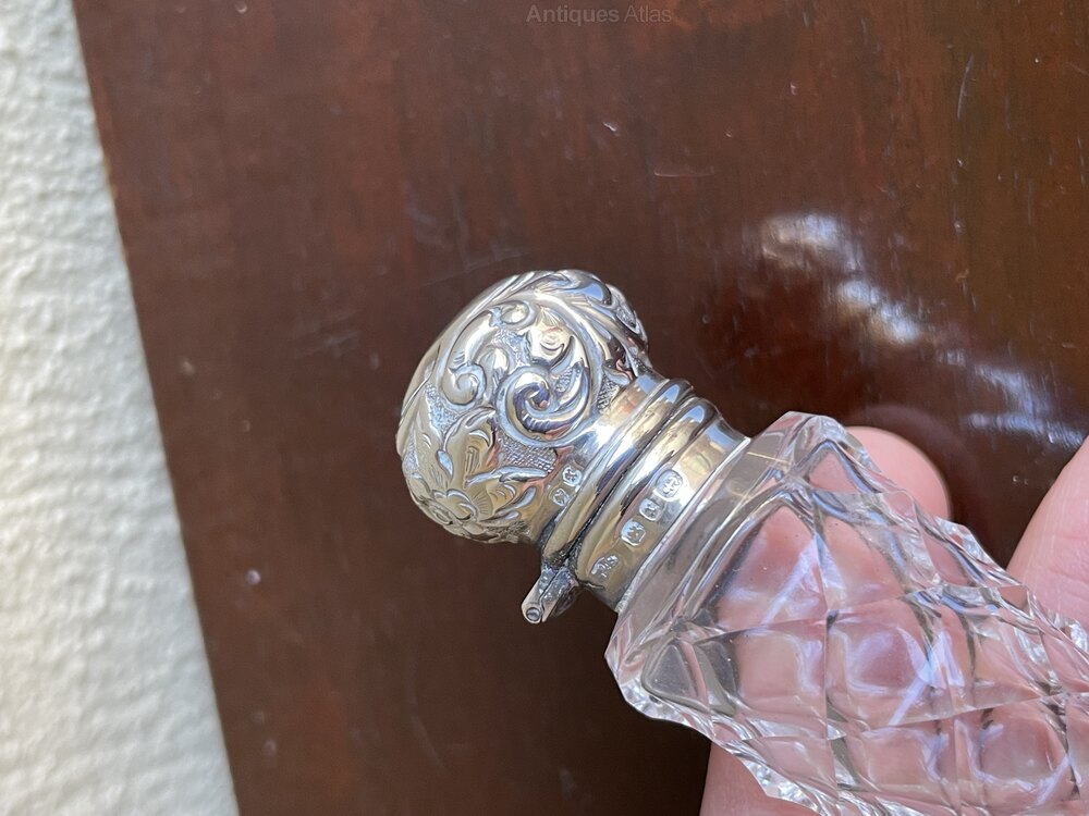 A good late Victorian solid silver mounted scent bottle with repousse decorated hinged lid on a fabulous tapered cut glass bottle. Hallmarked Birmingham 1898.