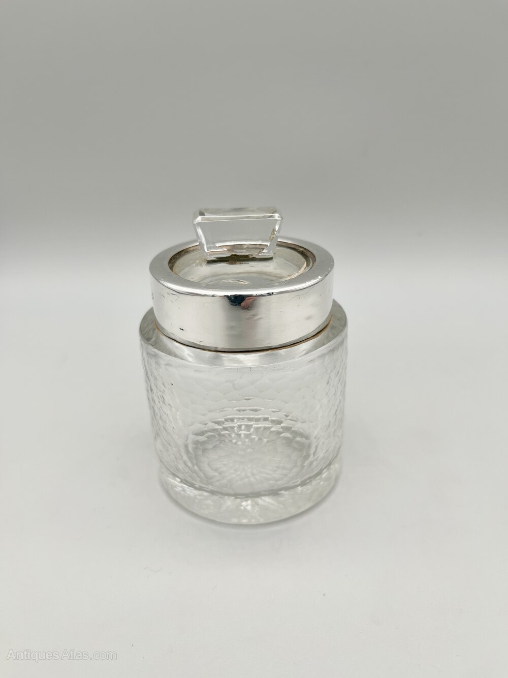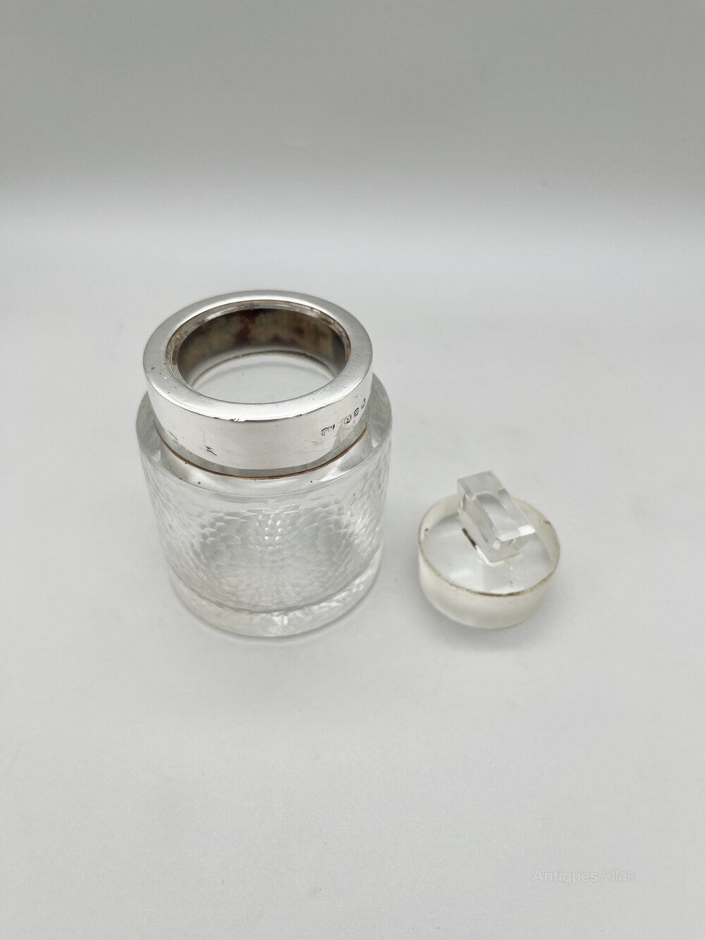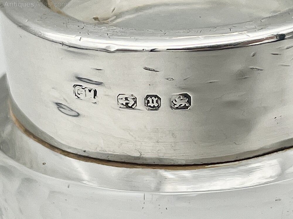 Condition is good, with no chips or cracks in the glass pot, a few little dings in the silver collar and a small nibble out of the top of the glass stopper. It remains pefectly usable. Please make sure to view all the photographs.