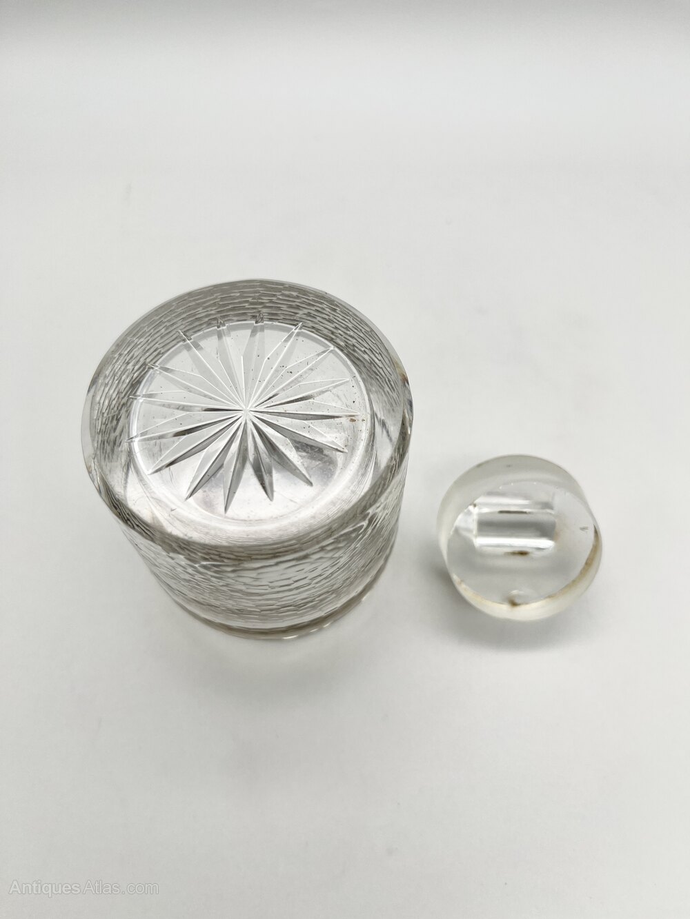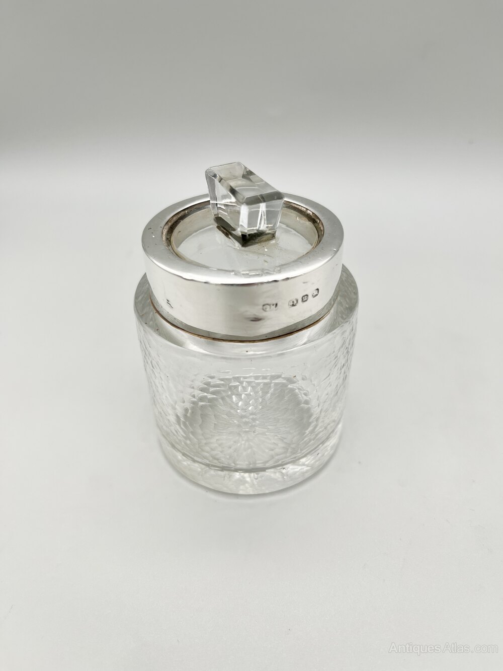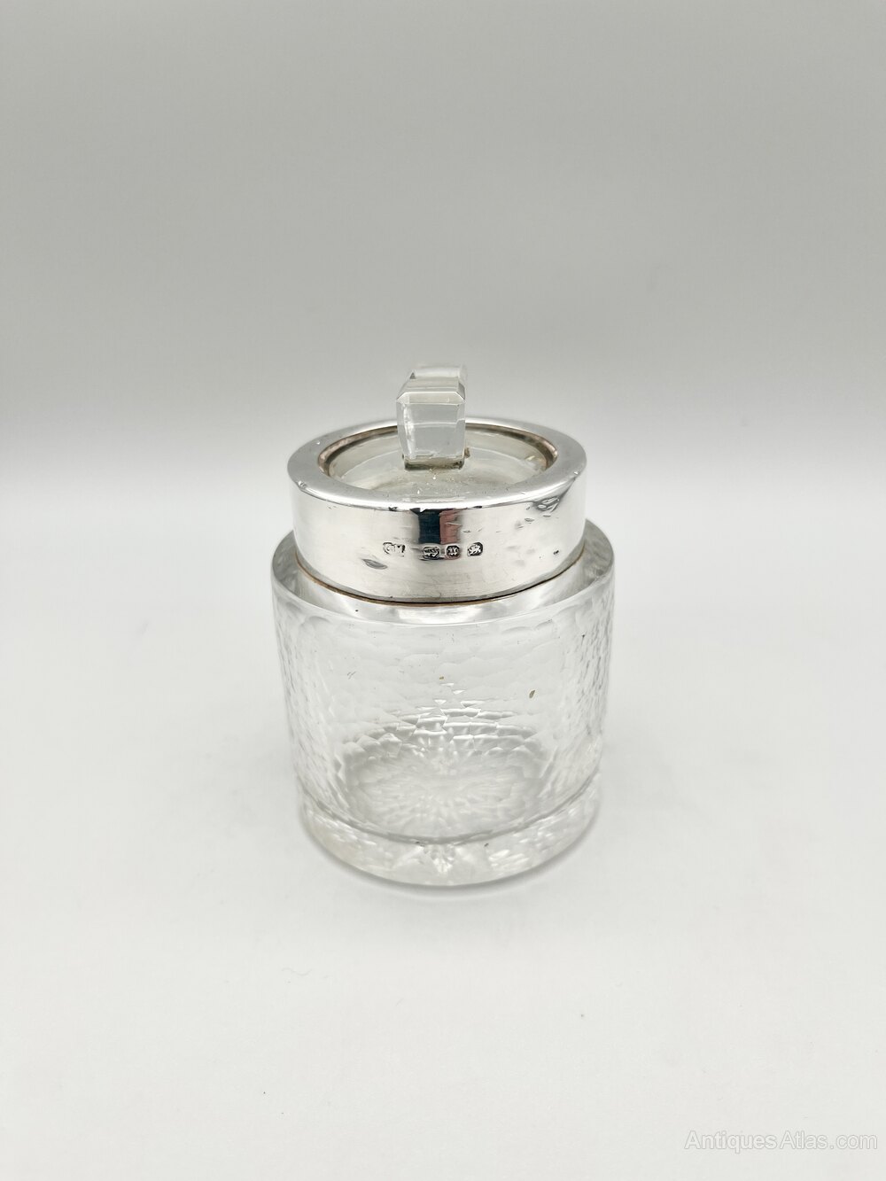 Condition is good, with no chips or cracks in the glass pot, a few little dings in the silver collar and a small nibble out of the top of the glass stopper. It remains pefectly usable. Please make sure to view all the photographs.