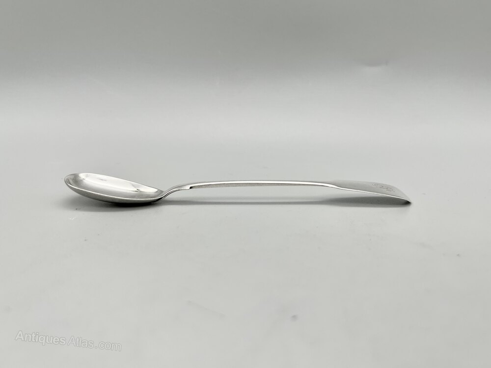 The spoon was made in Exeter by silversmith John Stone and dates to 1854. John Stone was one of Exeter's foremost silversmiths. He was a specialist spoon maker working from premises initially in New Bridge Street and later the High Street between the early 1820s and his death in 1868. He was succeeded in the business by his son Thomas Hart Stone who registered his own mark in 1863 and after his death in 1873 was in turn followed by his widow Frances Stone.
