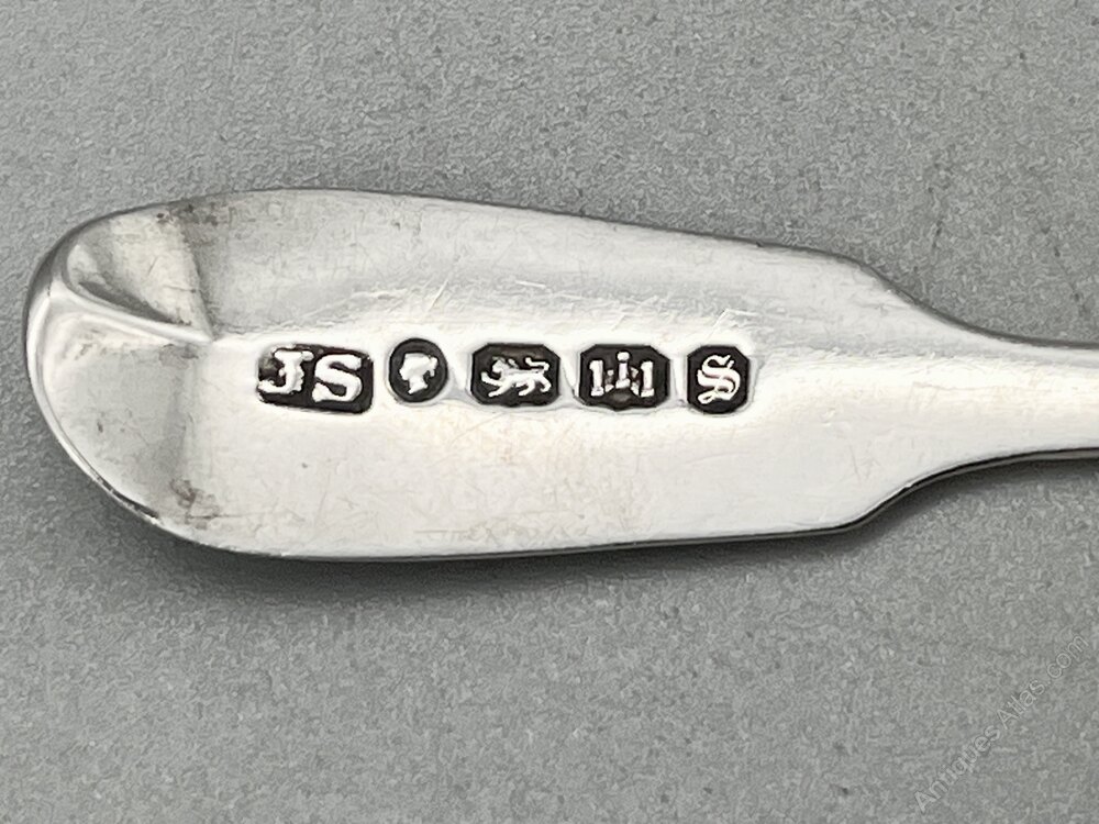 The hallmarks, on the underside of the stem, are well struck and clear to read. They show the lion passant for Sterling Silver, the three towered wall assay mark for Exeter, the date letter S for 1854, the Queen Victoria duty mark and the J S makers' mark for John Stone.