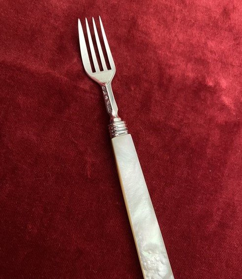 A beautiful design with mother of pearl handle, a sterling silver scroll design collar and sterling silver tines.