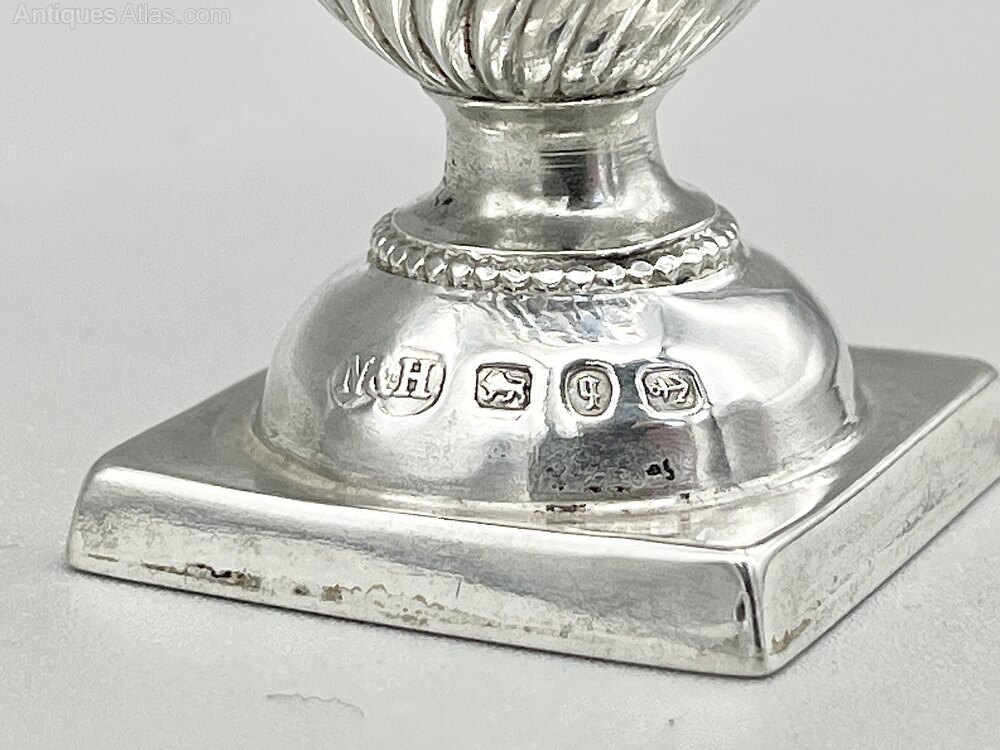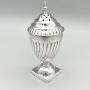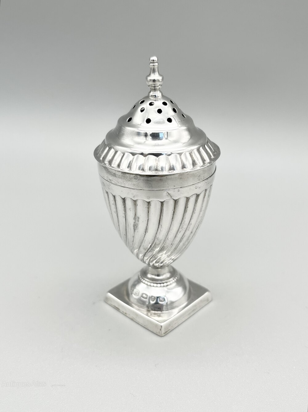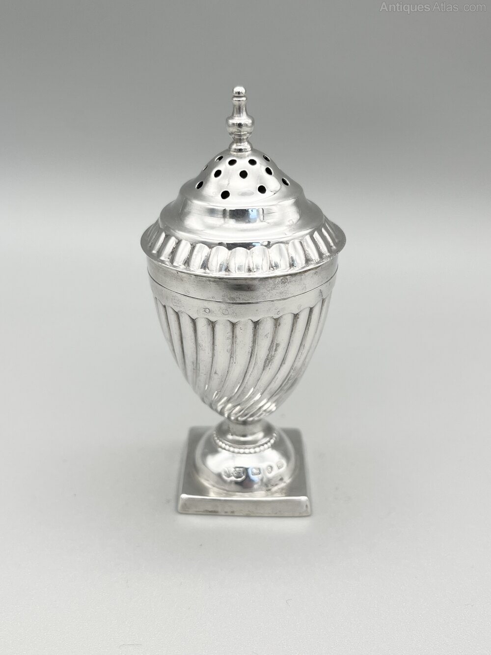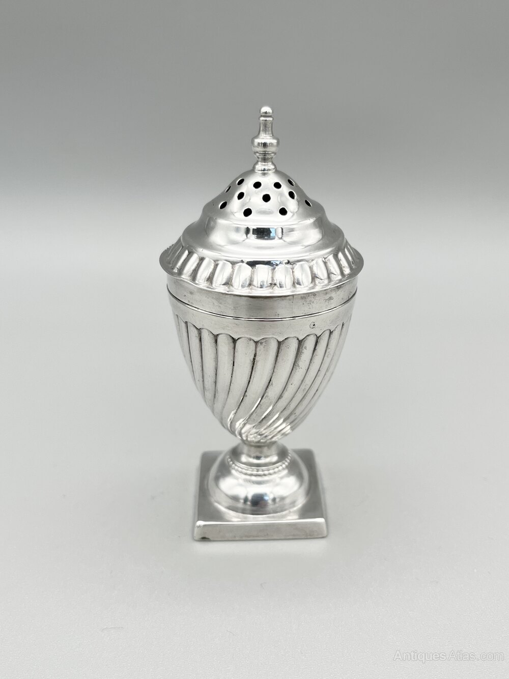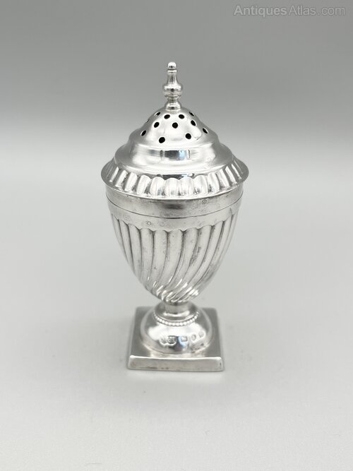 This is a smart Victorian Sterling Silver Pepper Shaker in the Georgian Revival style of the late 19th century. The shaker has a square base, a domed foot with beaded decoration and a wrythen classical urn shaped body. The screw on lid is domed with a reeded rim and turned finial.