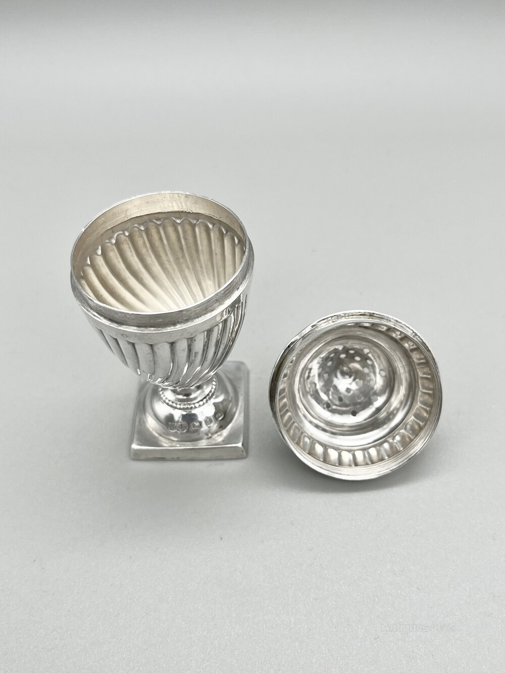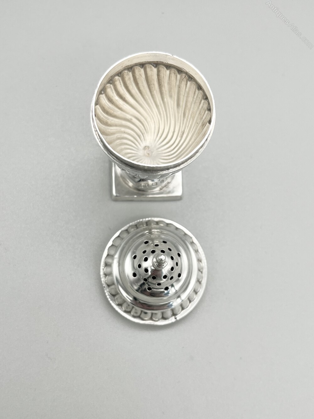 The shaker stands 8cm / 3.1ins high and is 3.5cm / 1.4ins in diameter across the top rim of the body. It weighs in at a respectable 26.6g / 0.94oz of solid Sterling Silver.