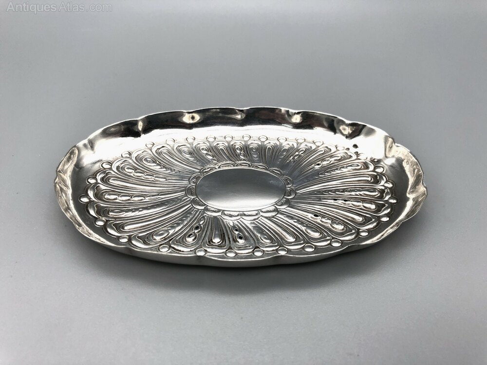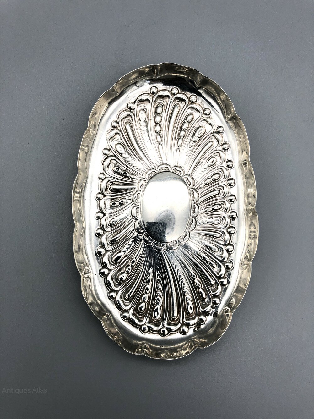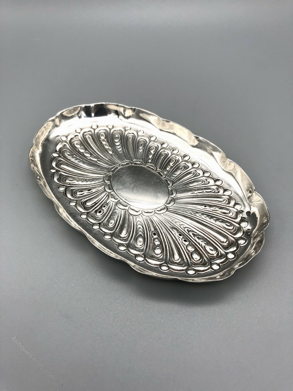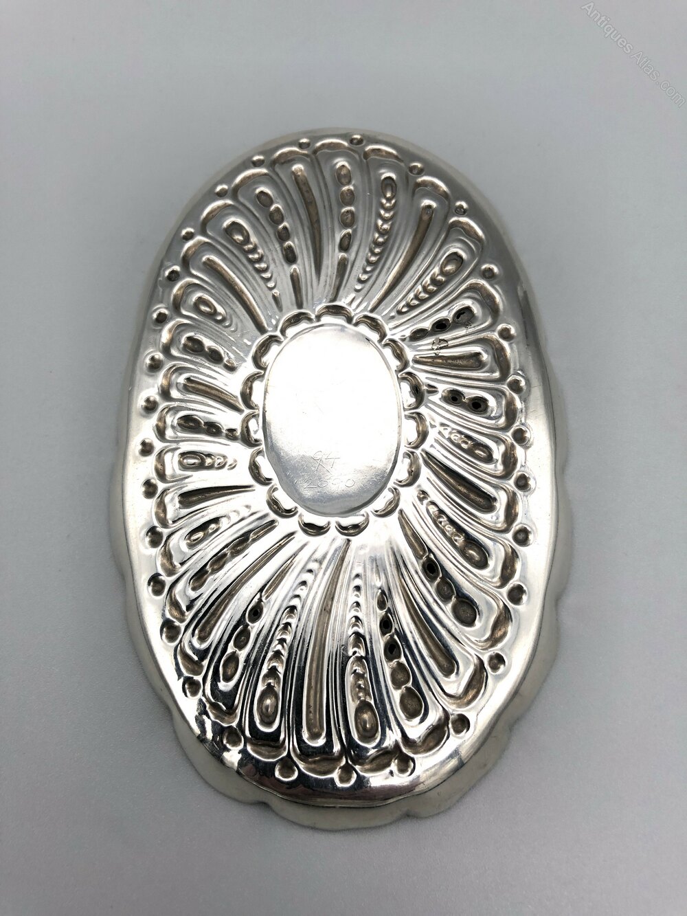 The dish is 11.5cm / 4.5ins long by 7.2cm / 2.8ins wide and 0.8cm / 0.31ins high. It weighs in at a respectable 34.6g / 1.2oz of solid Sterling Siver.