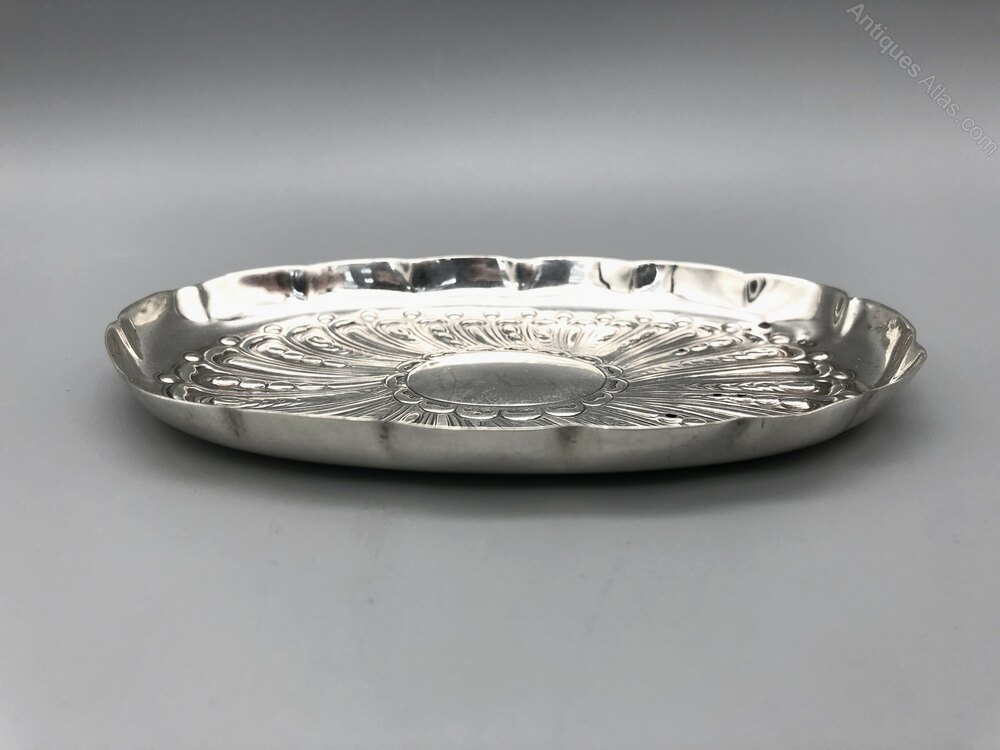 This is an attractive late Victorian Sterling Silver Trinket Dish. The dish is oval with a crimped rim. The base is embossed with a curving fan design around a central blank cartouche. It would look very elegant on any dressing table or bedside cabinet today.