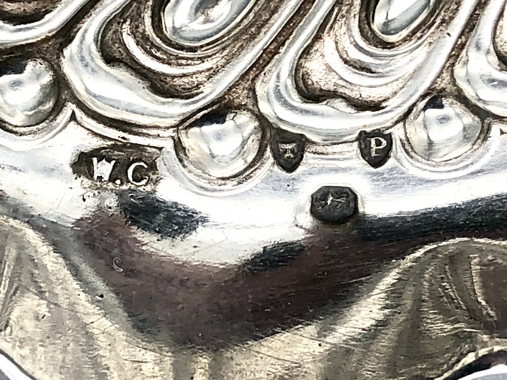 The hallmarks, on the inside base in one corner, are nice and clear to read. They show the lion passant for Sterling Silver, the leopard's head assay mark for London, the date letter P for 1890 and the W.C makers' mark for William Comyns & Sons.