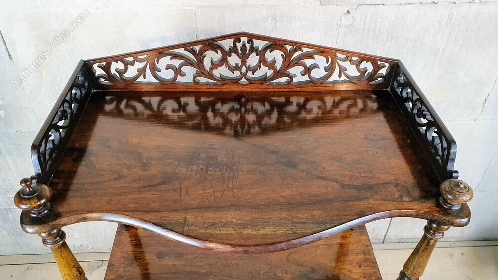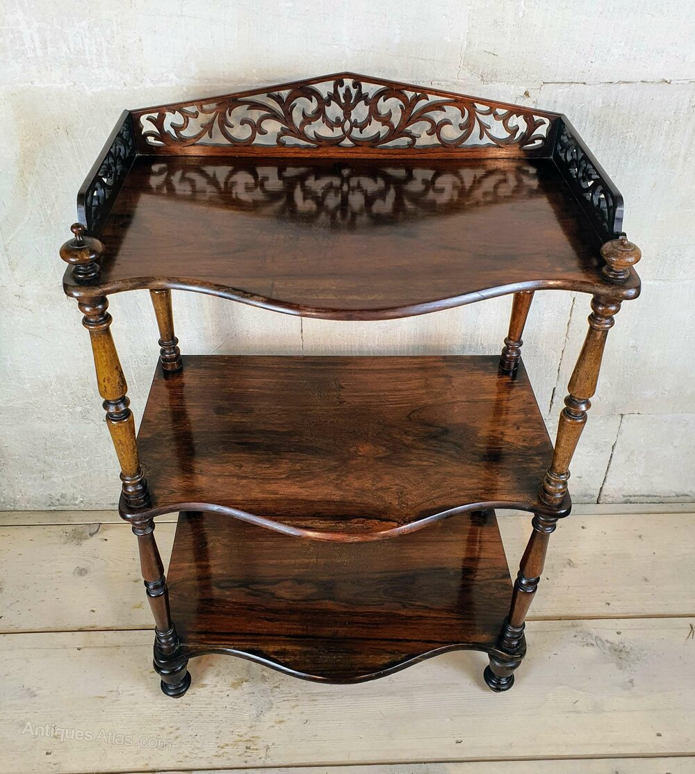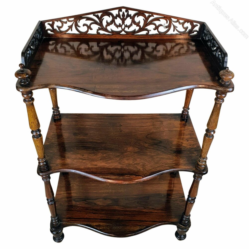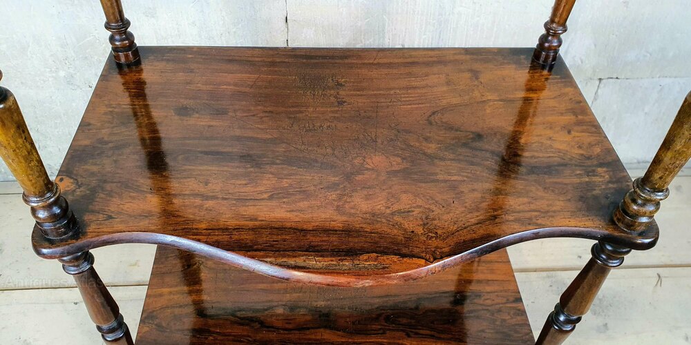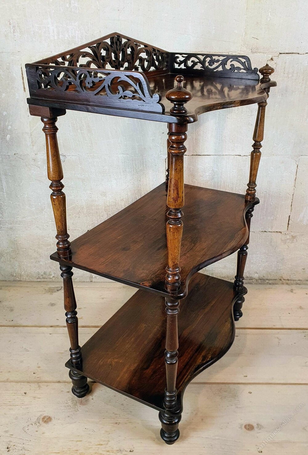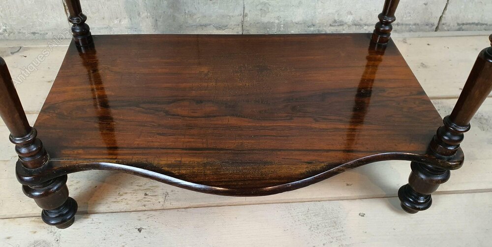 Delightfully small Rosewood Whatnot, with beautiful patina. One missing finial tip. Small enough to sit on a desk or within larger shelf.