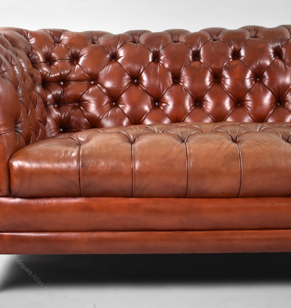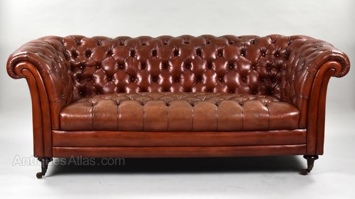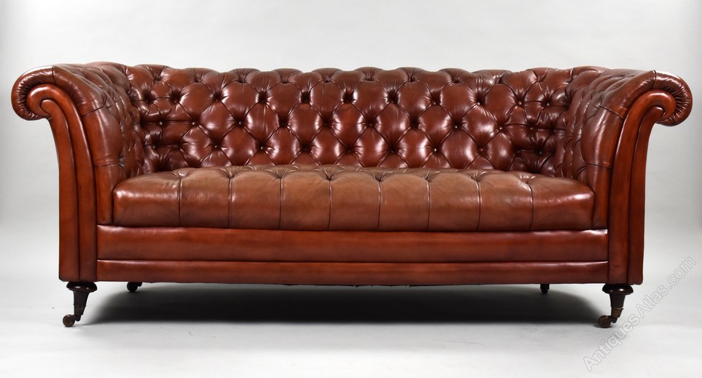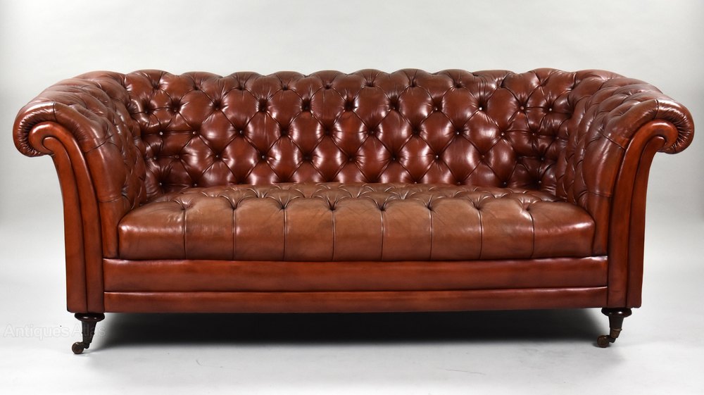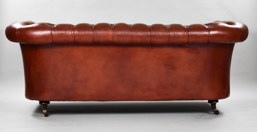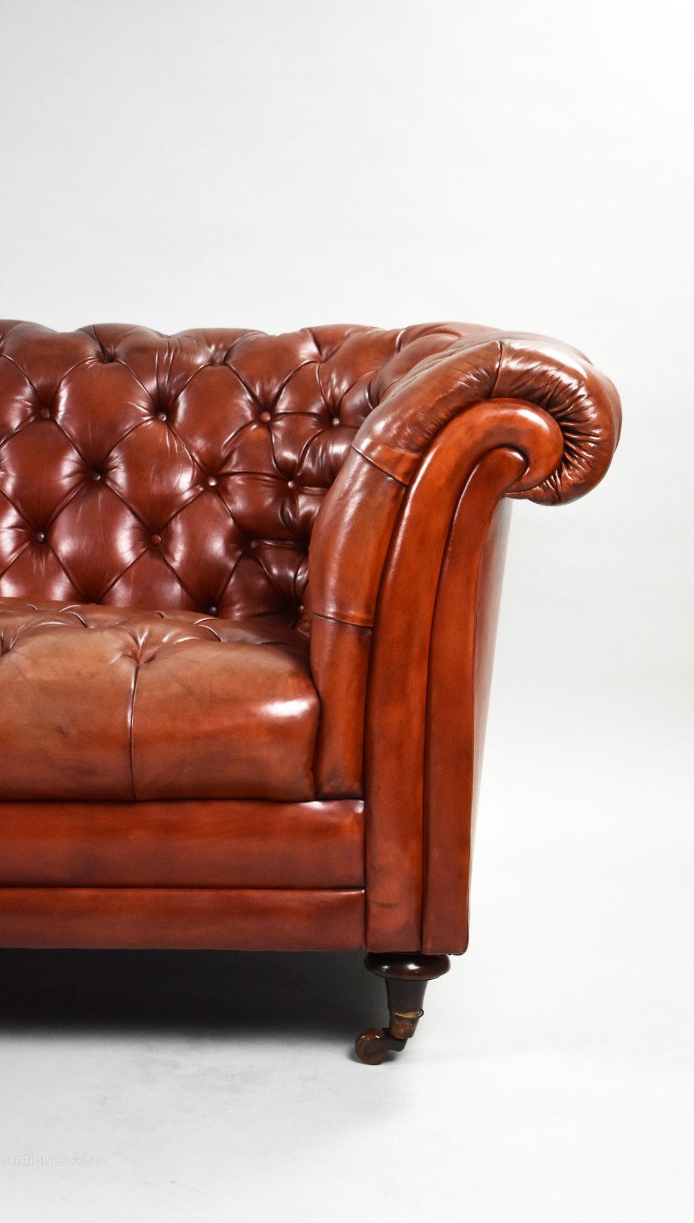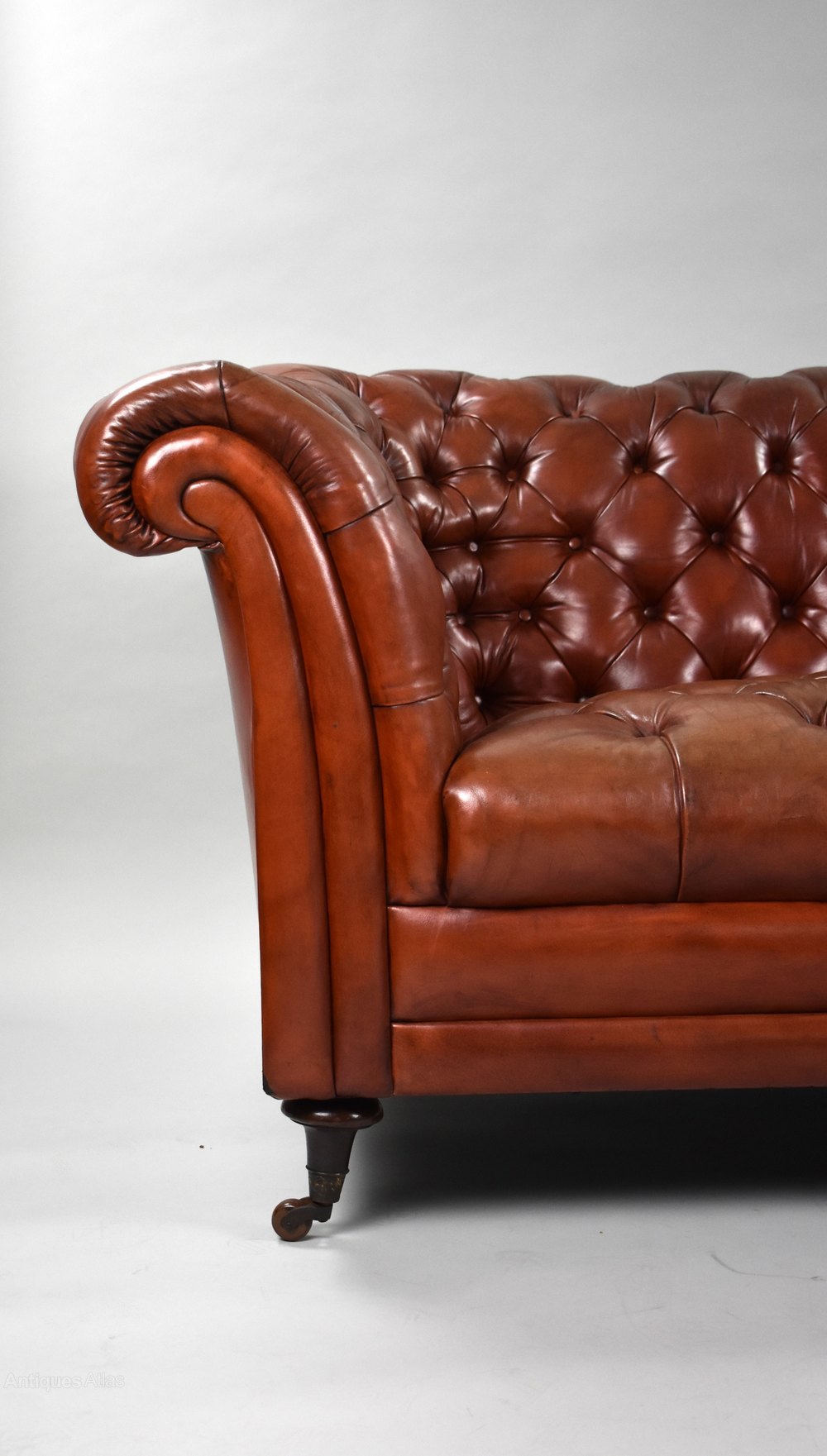 Victorian Leather Chesterfield sofa in good condition with buttoned back and seat with scroll over arms standing on turned feet on castors.