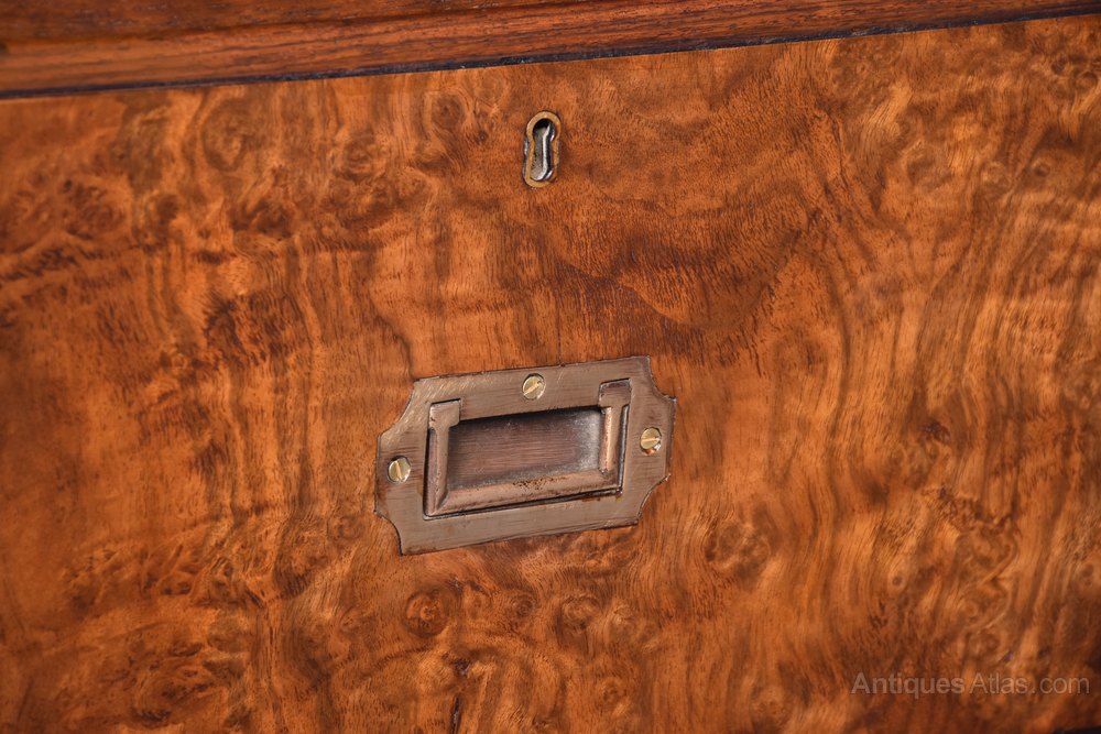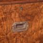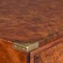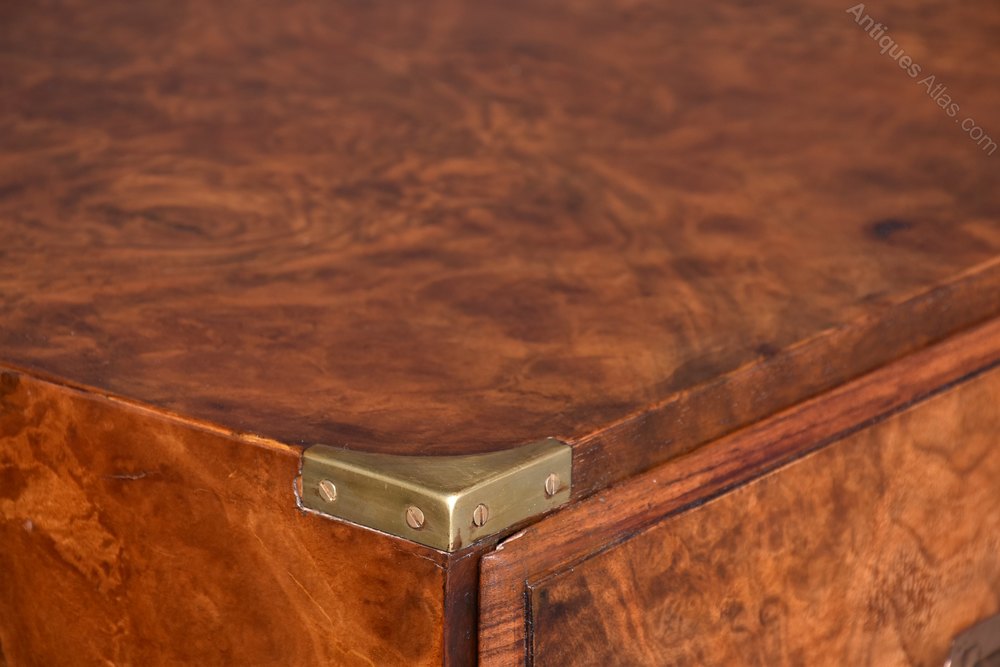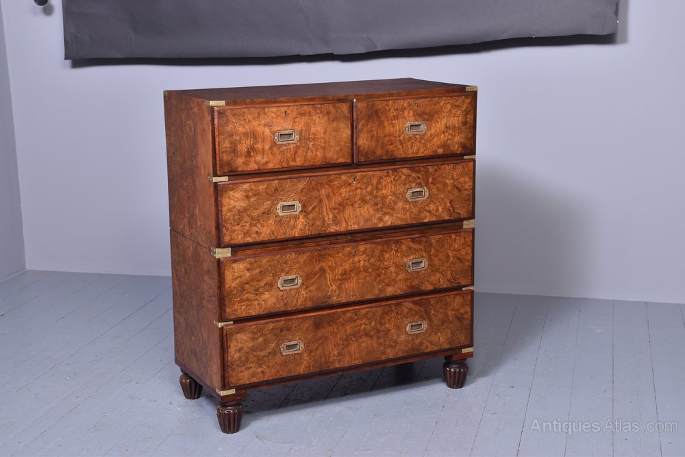Circa 1860 with alterations. Two-part burr walnut Victorian military (campaign) chest of drawers on a solid teak carcass with brass strapping. The rectangular top in figured walnut with brass corners above two short and two long drawers in upper and two long drawers in lower section all with inset military handles. All supported on neat, fluted bun feet. 104cm wide 49cm deep 116cm high.