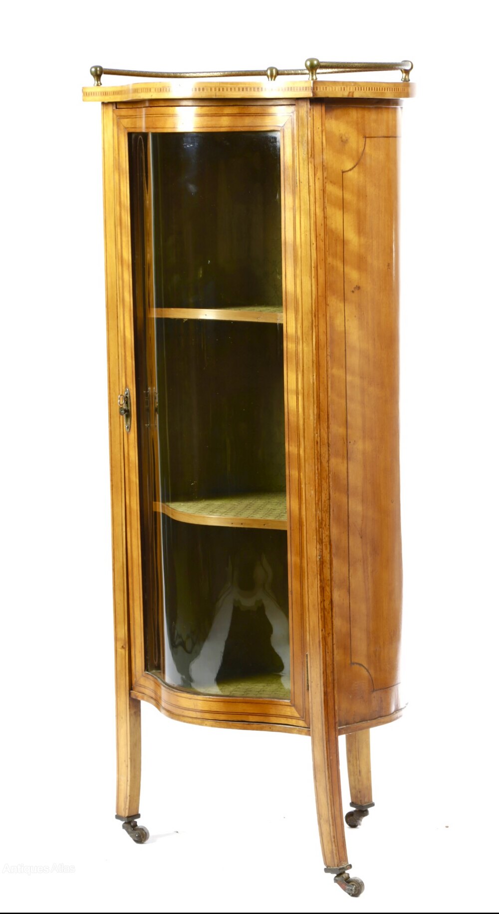This very unusual and well cared for cabinet made in highly desired satinwood has a barrel back allowing it to be placed in a variety of positions, including corner or freestanding. Complete with a brass gallery back for safely placing ornaments on top, over a serpentine glazed door and enclosing shelves. The splay legs have the original brass casters which can be removed if so desired.