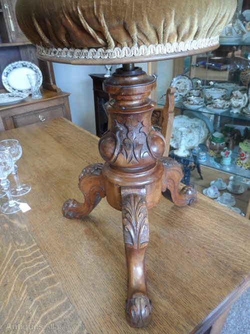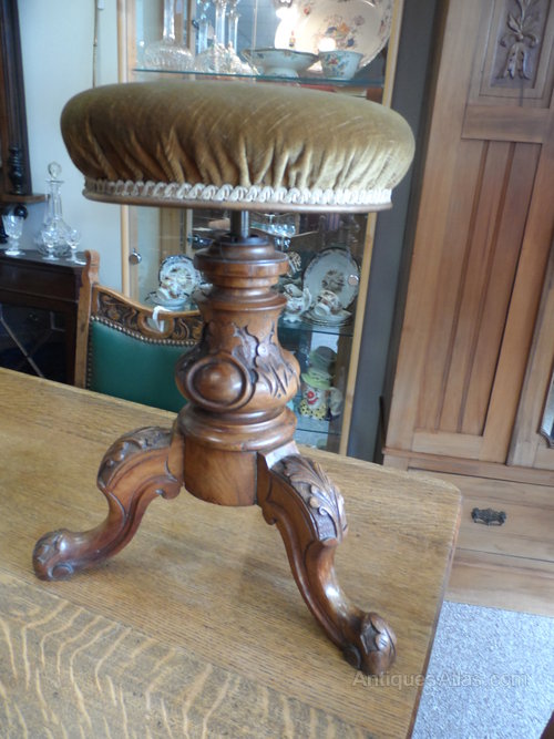 Victorian dressing table stool in walnut, having height adjustable seat, turned and carved column terminating in 3 cabriole legs. This wonderful antique stool retains it original finish and colour. Circa 1870
