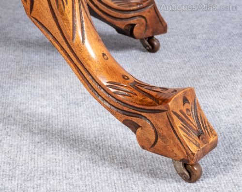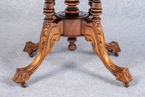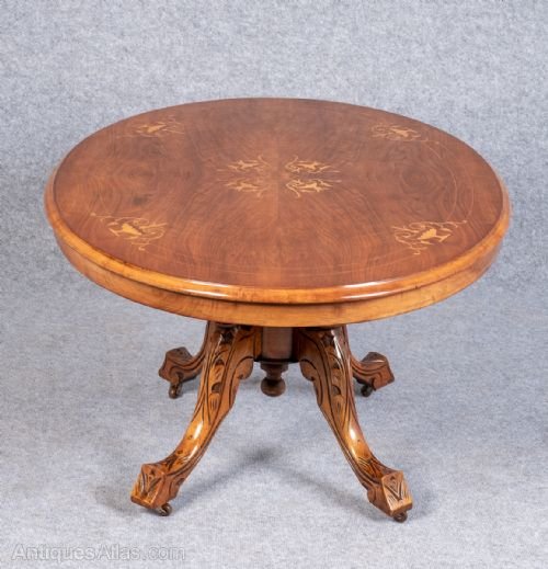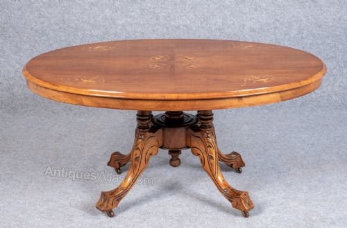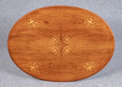 An attractive Victorian walnut and inlaid coffee table. The oval shaped top having a moulded edge with inlaid boxwood panels. The base having 4 ring turned columns and raised on 4 outswept legs with turned finials, carved feet and casters. In fine condition and adapted in height to suit todays living. Dimensions:- Height…22.75’’/ 58cm. Width…47.5’’/ 120.5cm. Depth…34.5’’/ 87.5cm. Delivery to most of U.K. mainland £50.