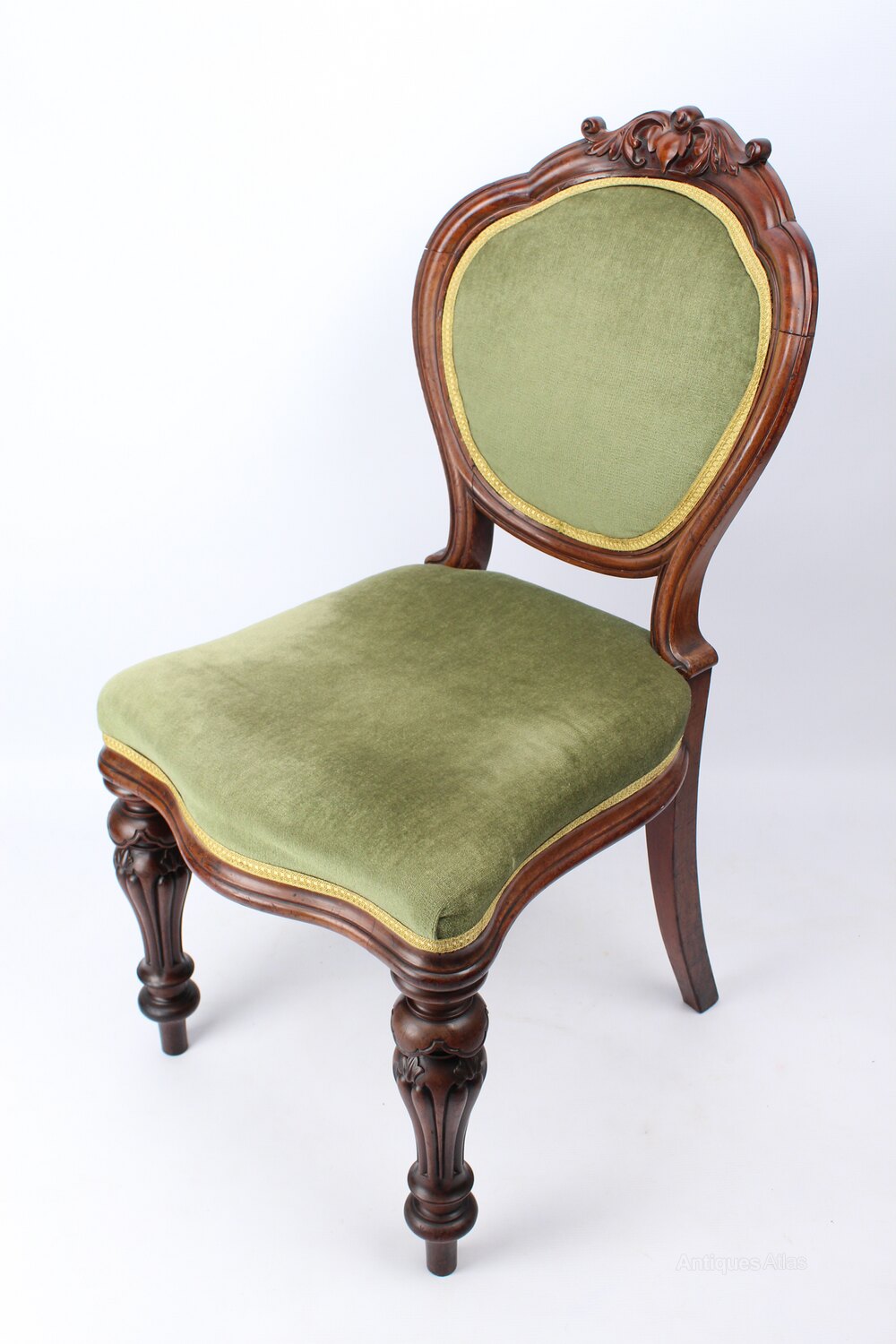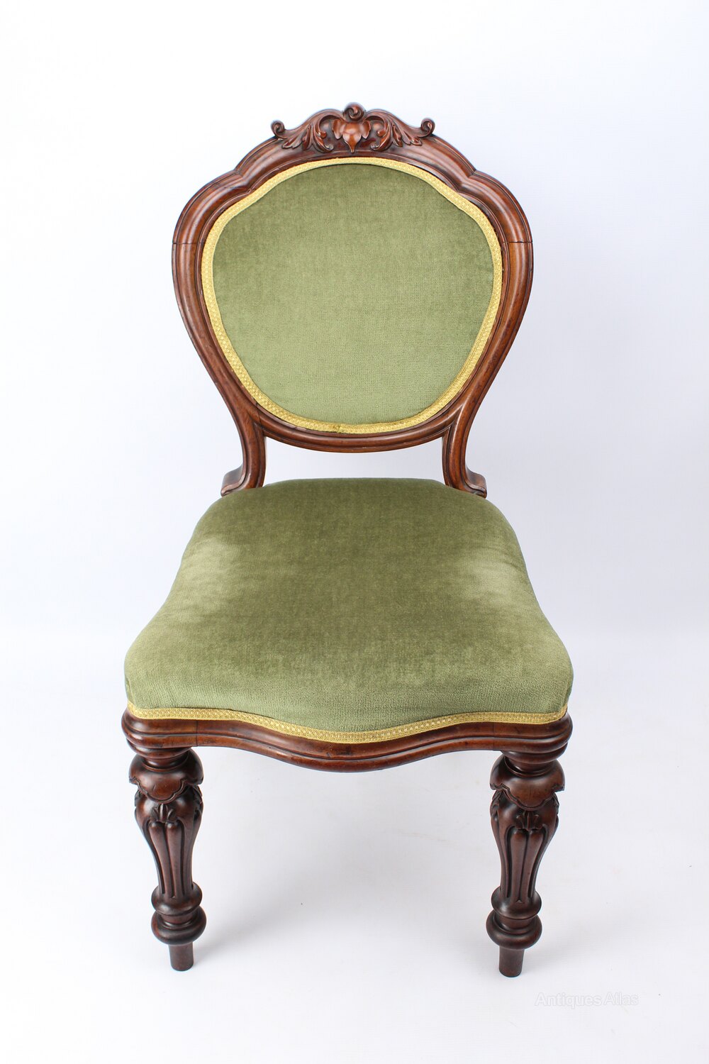 A beautiful antique Victorian walnut bedroom chair or desk chair, dating from circa 1860 and made by celebrated Liverpool cabinet makers Arbuthnot Blain. This stunning example has rich warm colour and superb patina and features a beautiful padded back and carved top crest. The serpentine fronted and overstuffed seat base is sat on two expertly carved front legs. The chair is sturdy with no loose joints, it has green upholstery trimmed with gold coloured braid and is in good condition. The underside of the chair has the makers stamp.
