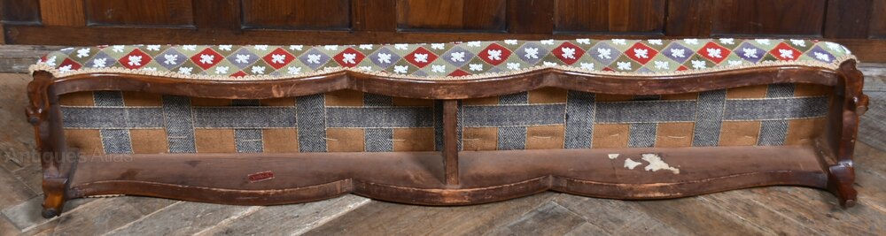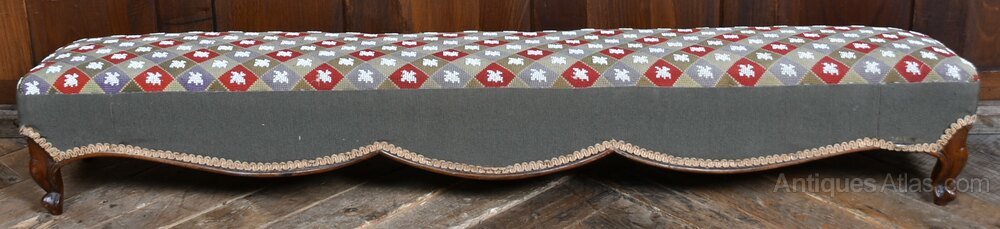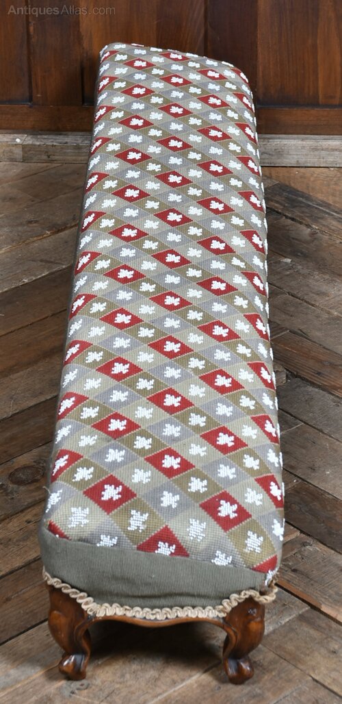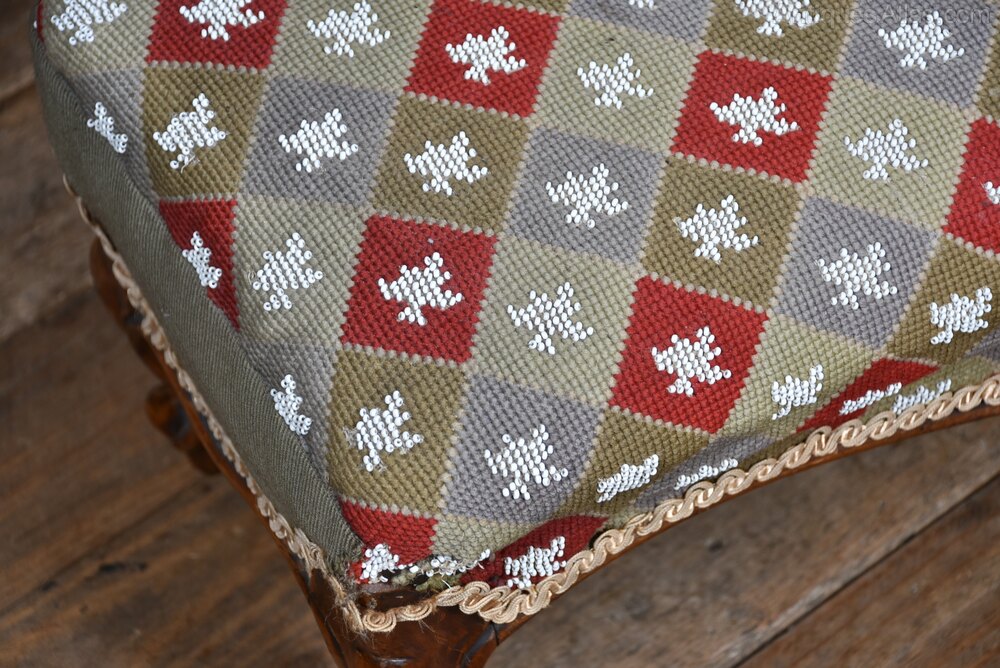 A charming Victorian walnut fender stool upholstered in a beadwork fabric featuring a repeating diamond motif in tones of red, green, and grey. The lower section is finished in deep green fabric, edged with a scalloped trim and decorative braid that lends texture and contrast. Raised on carved wooden legs with a shaped apron, the stool offers both comfort and visual appeal. Its craftsmanship and textile detailing make it a versatile accent—equally suited to hearthside seating or as a decorative feature in a hallway or drawing room.