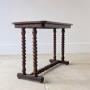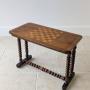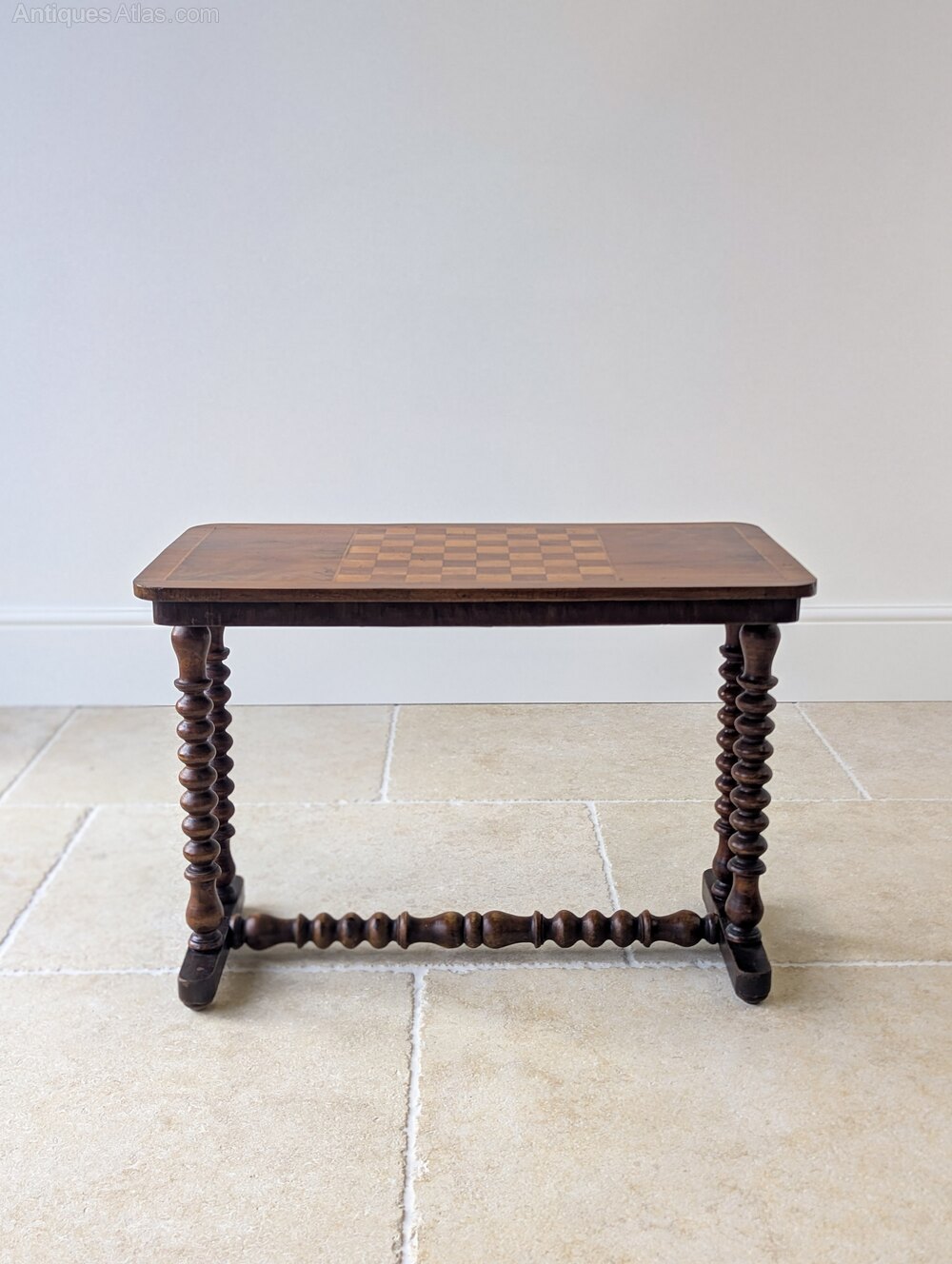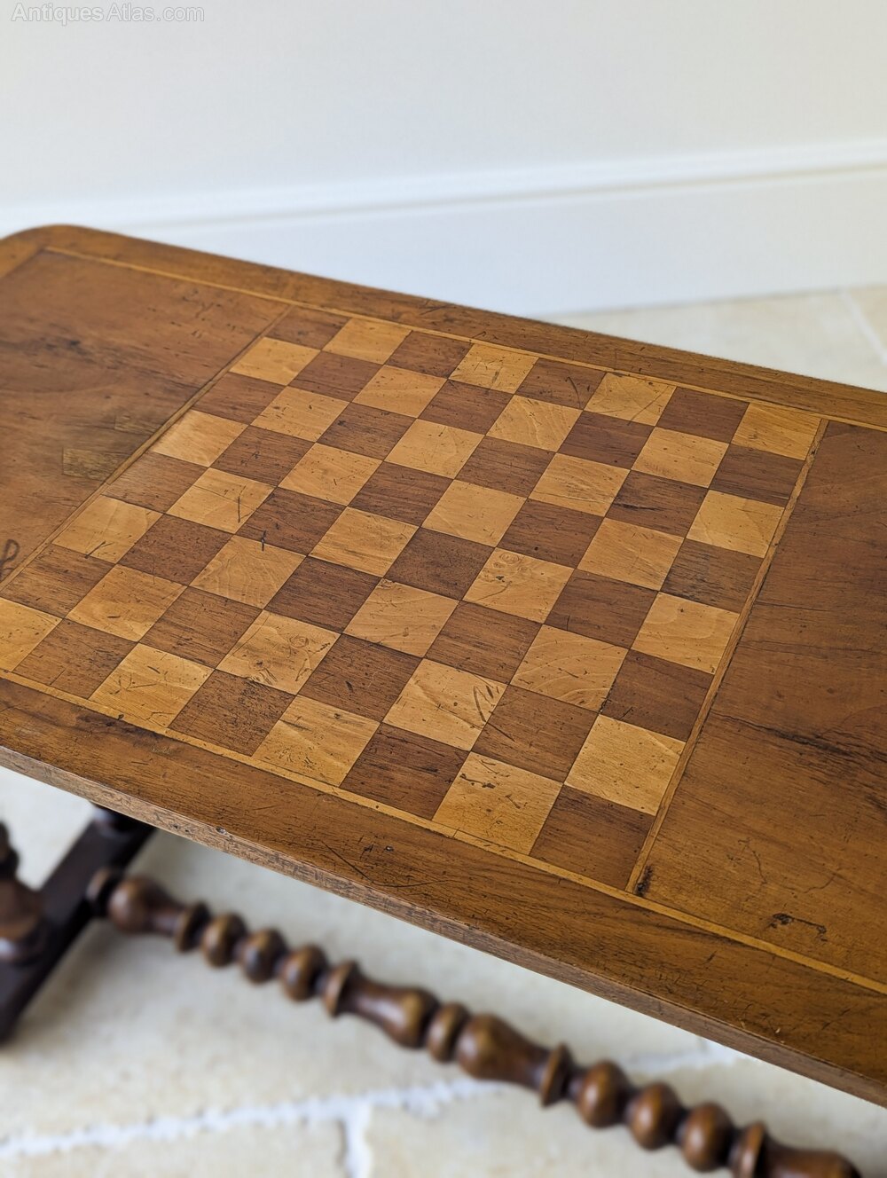 A characterful Victorian walnut games table, the rectangular top incorporating an attractive inlaid walnut and sycamore chessboard set within a framed veneered field, finished with gently rounded corners. The table is raised on paired bobbin-turned supports at each end, united by a full-width bobbin stretcher, all resting on solid sections with small turned feet.
