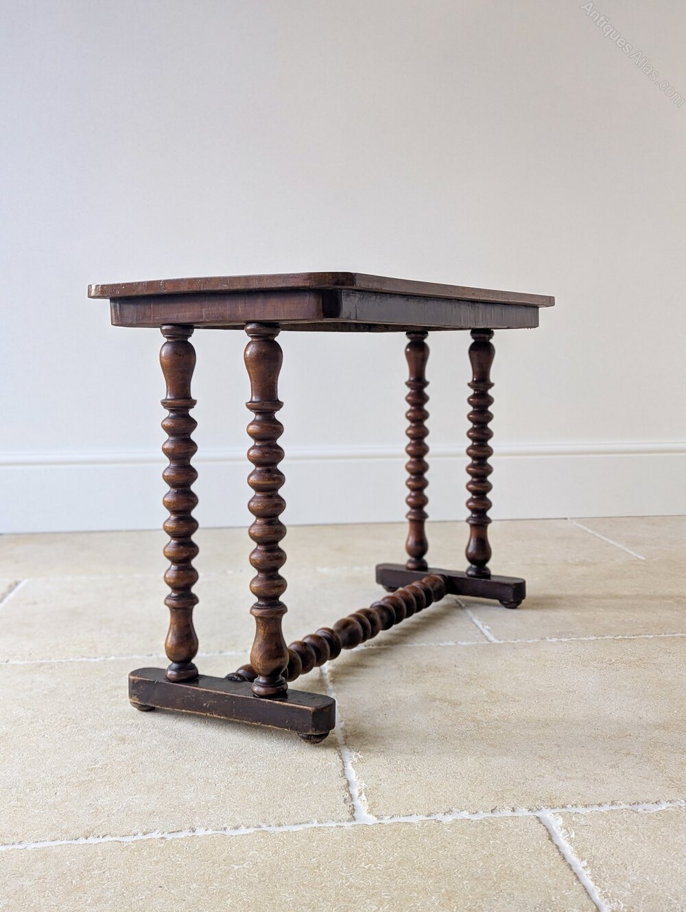 Presented in very good antique condition with an attractive aged patina and surface wear consistent with use and age. The table sits at a comfortable playing height, the feet having possibly been reduced at some point, as suggested by the low stretcher position, a practical alteration that makes it particularly well suited to use alongside relaxed living room or lounge seating. Structurally sound, clean and ready to place in the home.