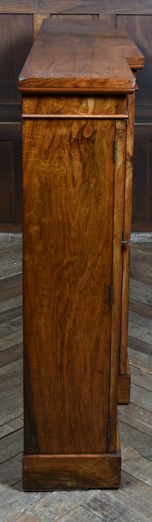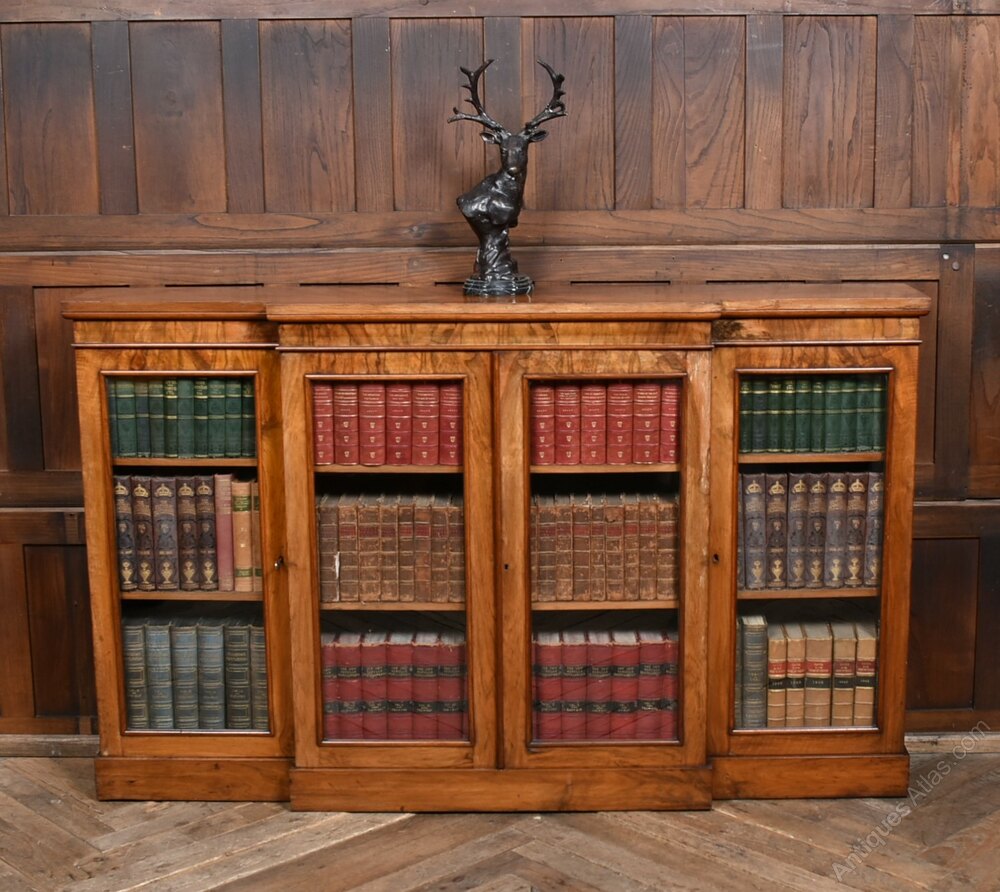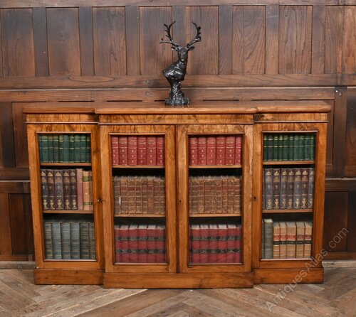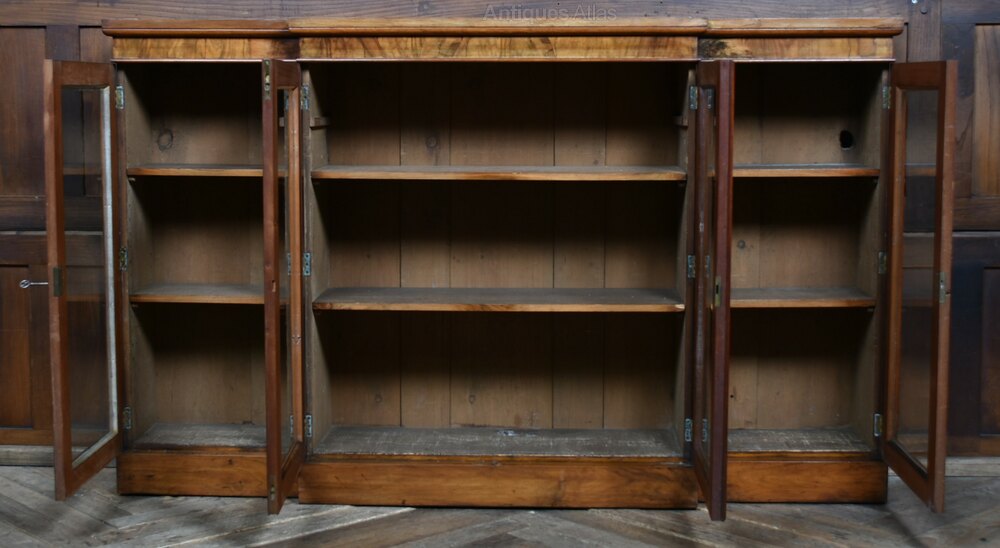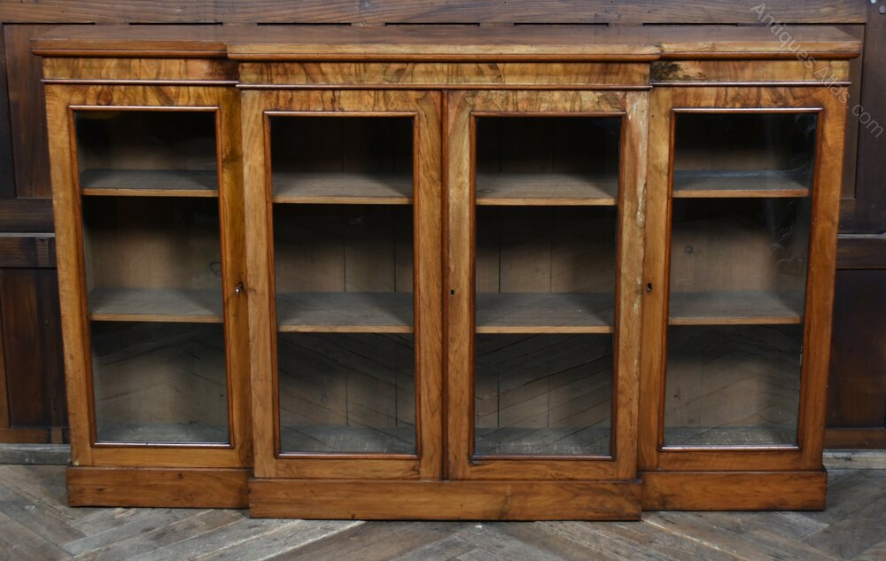 A superb Victorian walnut bookcase in excellent antique condition. The breakfront top beautifully showcases the richness of the walnut grain, echoed across the four glazed doors. Inside, the doors open to adjustable shelves, allowing you to tailor the interior to your collection. The bookcase comes with a key, though this operates only the left-hand door. As with all antique furniture, there are minor imperfections, but overall this is a beautifully crafted piece full of period charm. A classic, well‑proportioned bookcase offering both elegant display and generous storage, ideal for a study, sitting room, or library.
