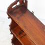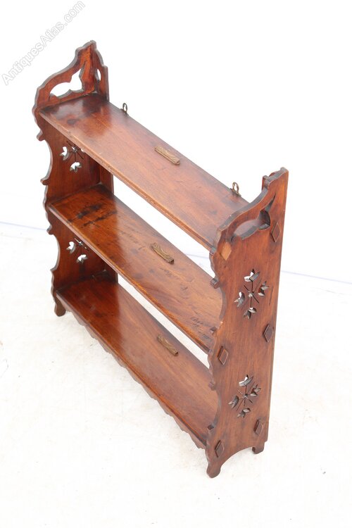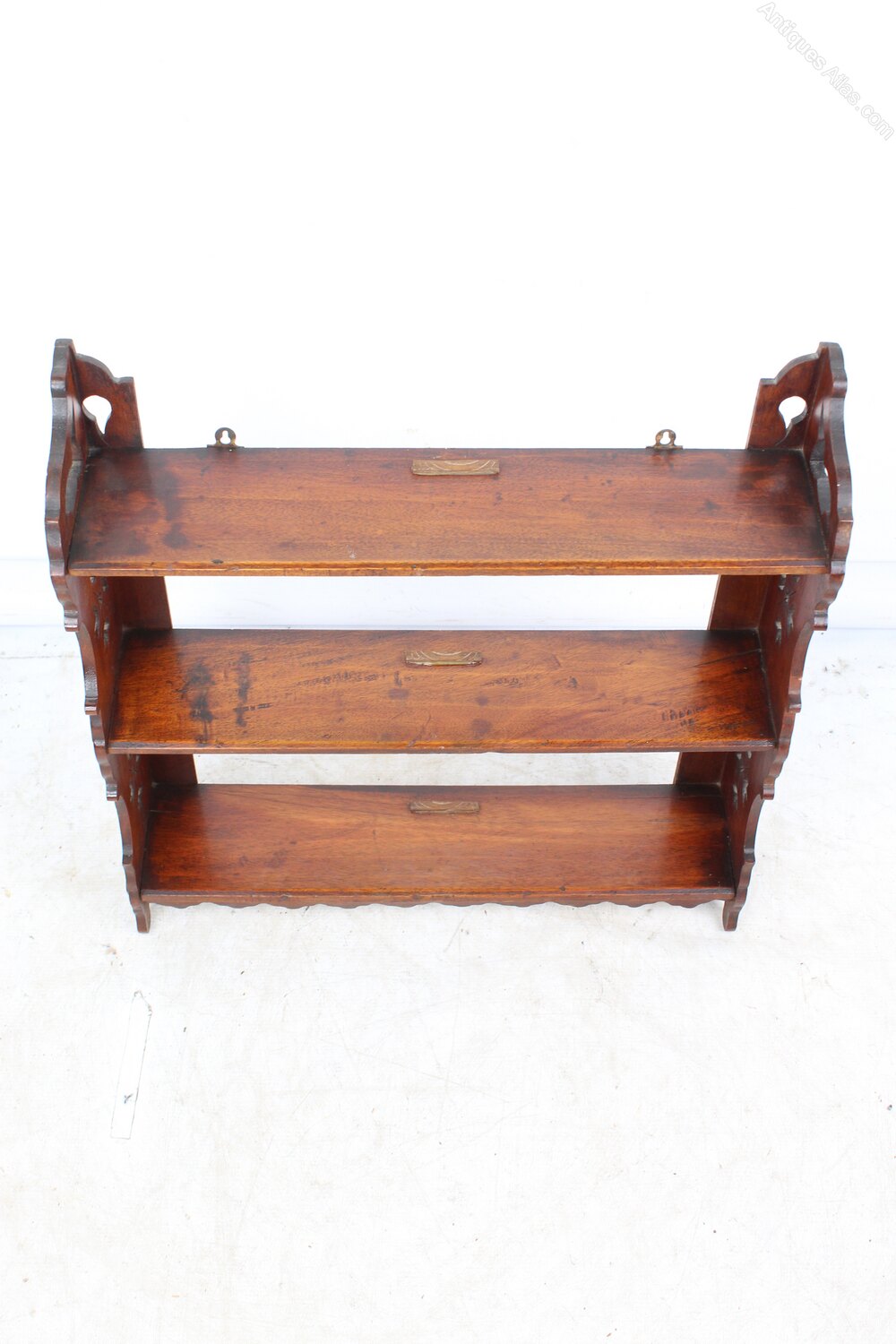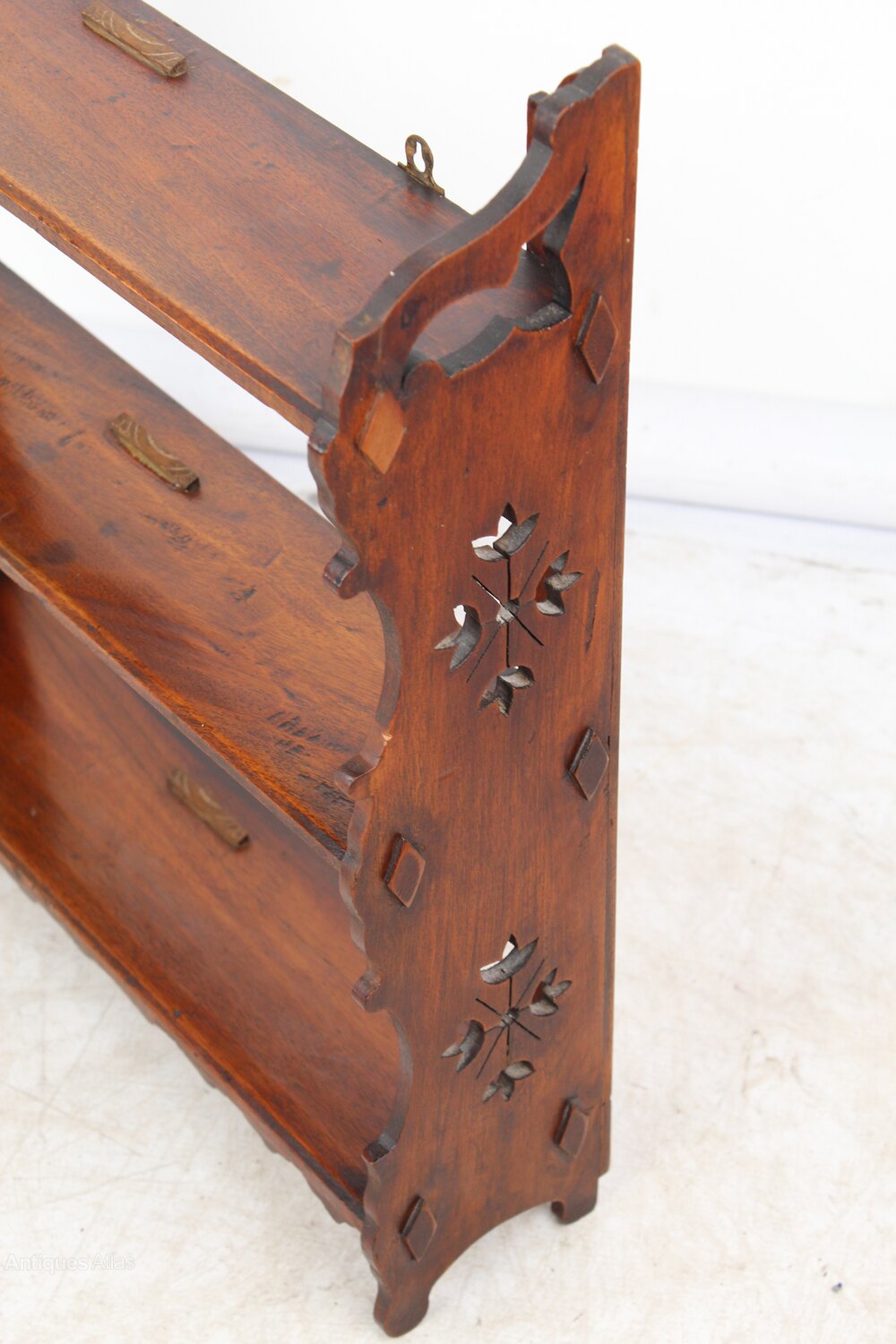 A charming antique Victorian walnut hanging wall shelf dating from circa 1880. Having three tiers with fretwork sides and a shaped base, the sides decorated with diamond shaped studs. With good original colour and patina, these shelves are a really stylish statement piece that would grace any room. Complete with brass wall fittings.