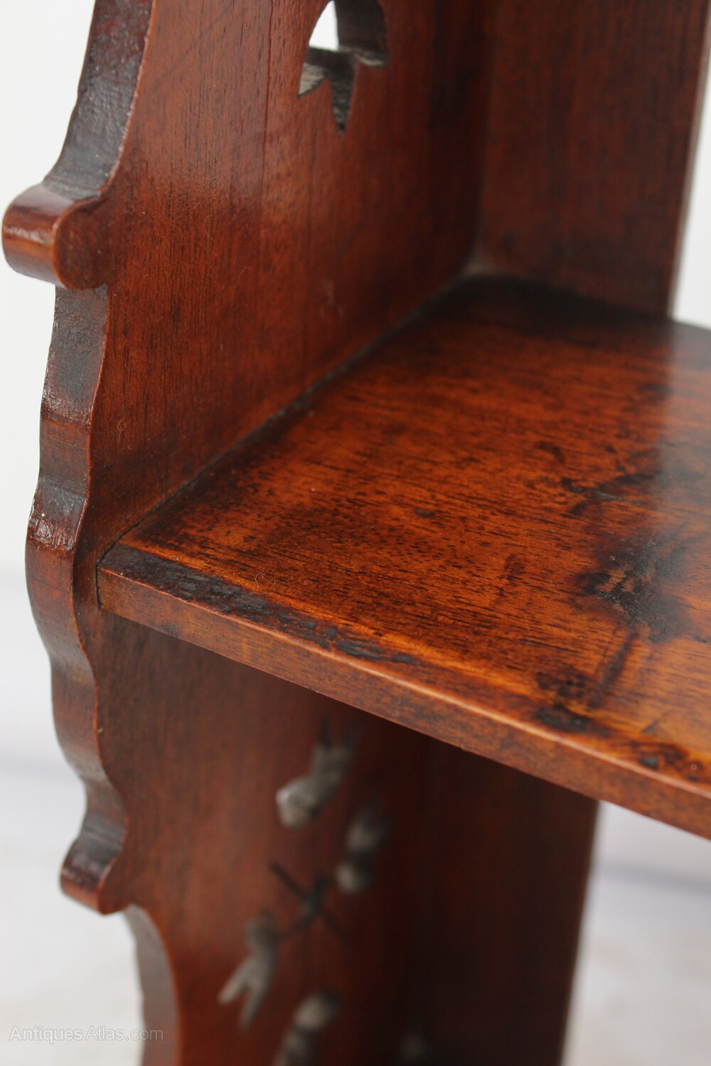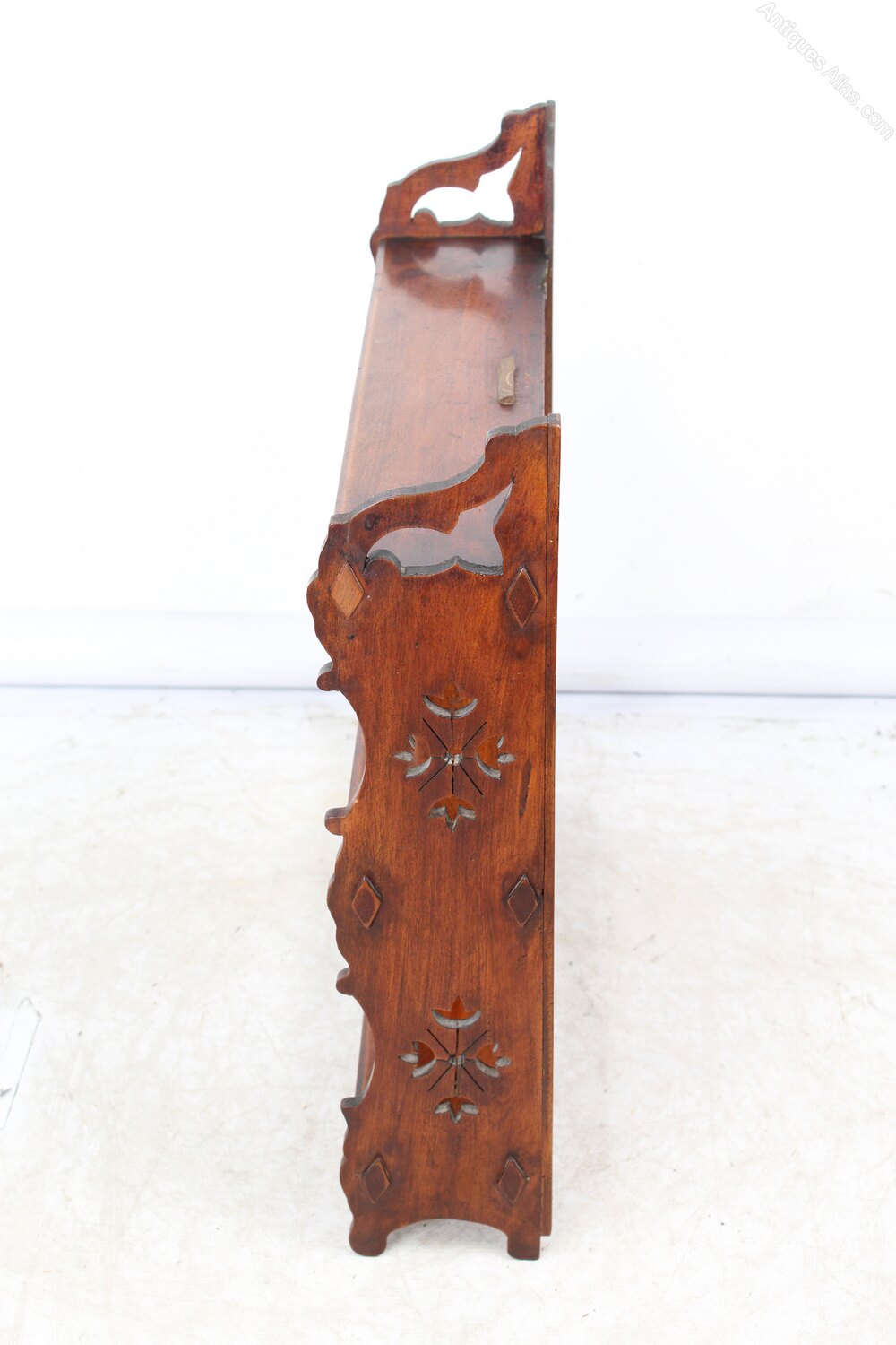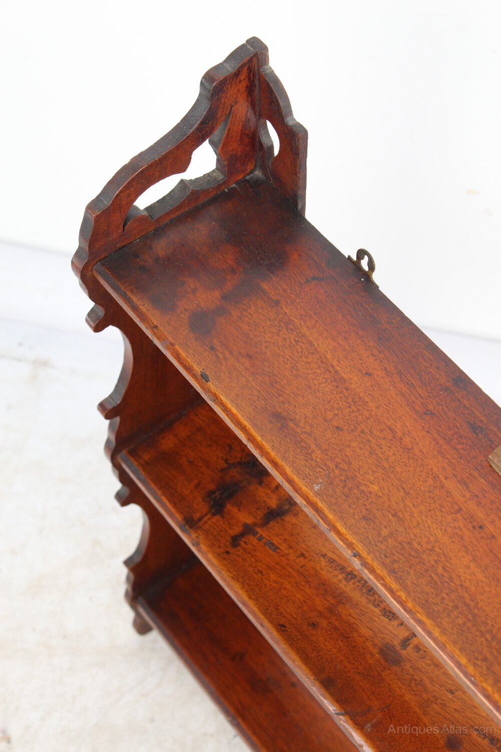 A charming antique Victorian walnut hanging wall shelf dating from circa 1880. Having three tiers with fretwork sides and a shaped base, the sides decorated with diamond shaped studs. With good original colour and patina, these shelves are a really stylish statement piece that would grace any room. Complete with brass wall fittings.