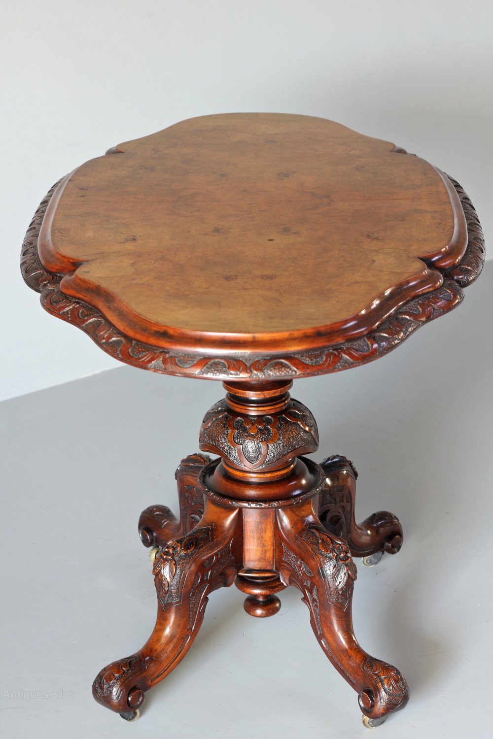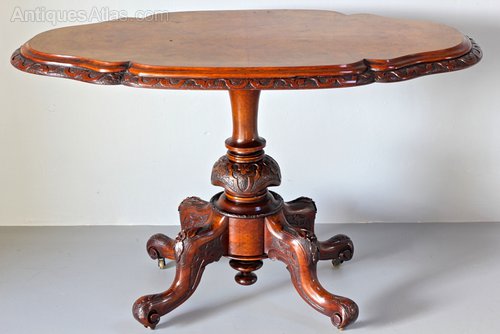 This Centre Table displays the flamboyance and quality of mid Victorian antique furniture making. The serpentine shaped oval top is quarter-veneered in figured walnut, the edge carved and stippled. It sits on a central column and 4 feet, all finely carved, and stands on original brass casters. Circa 1870.
