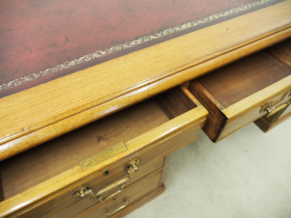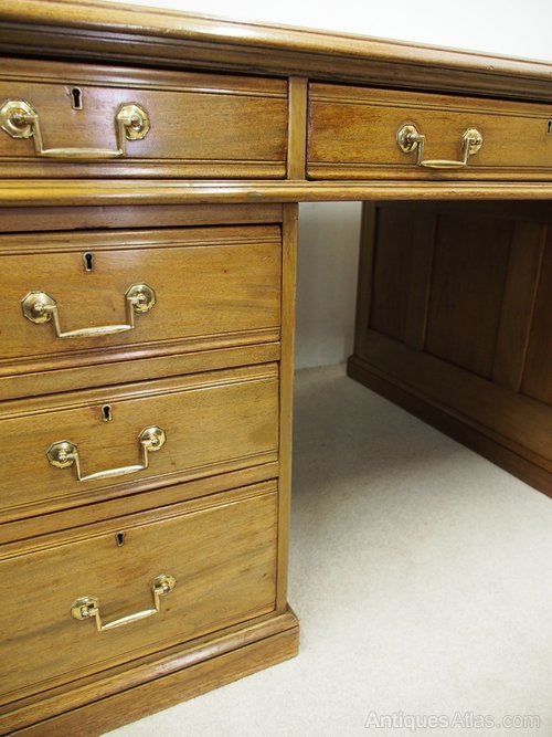 Circa 1880, impressive Victorian walnut partners desk. With unusual panelling at the sides and back, to both the frieze and main sections. The long central drawer and the bank of four graduated drawers on each side have unusual fluted mouldings and original rectangular, gilt-brass loop handles. The pedestals sit on enclosed plinth bases and the top has a later gilt-tooled, maroon leather.