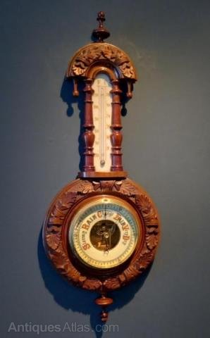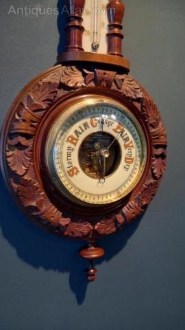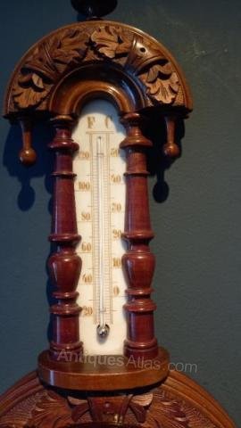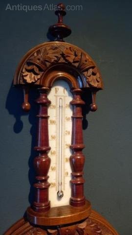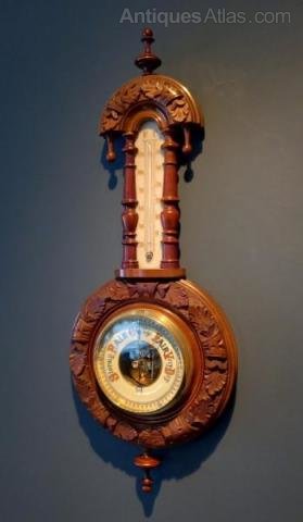 A Victorian walnut cased 'Pendant' banjo barometer c.1890. Porcelain dial with visible works to the centre. Brass bezel surround and bevelled edge glass. Porcelain thermometer scale above with mercury action thermometer. Leaf carved decoration to the small proportioned case, complete with turnings to the top and base. Full working order. Measures 21" long x 7" wide x 2.5" deep.