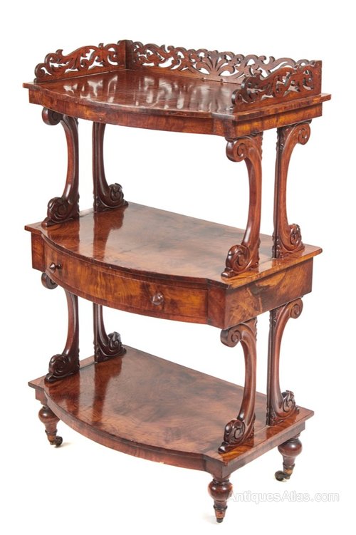 Victorian burr walnut shaped three tier whatnot,with pierced fretwork gallery, unusual scrolling end supports with a centre drawer, raised on four turned walnut legs with original brass castors,lovely colour and condition