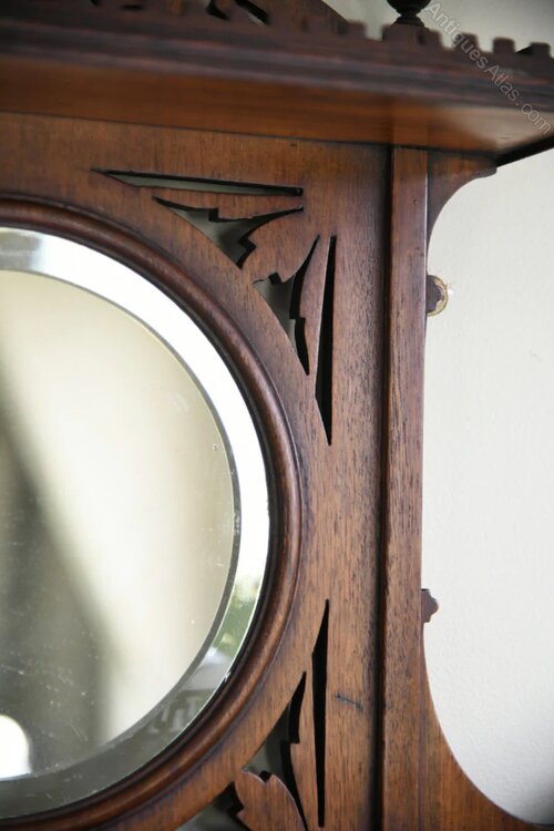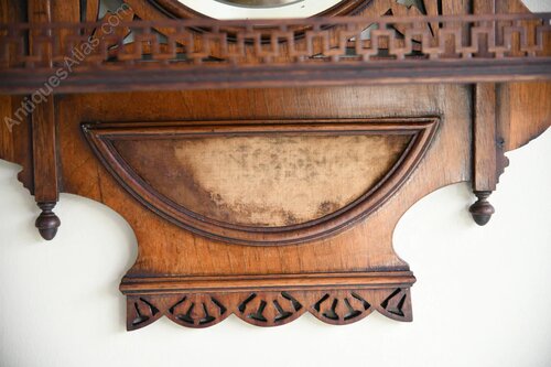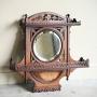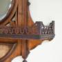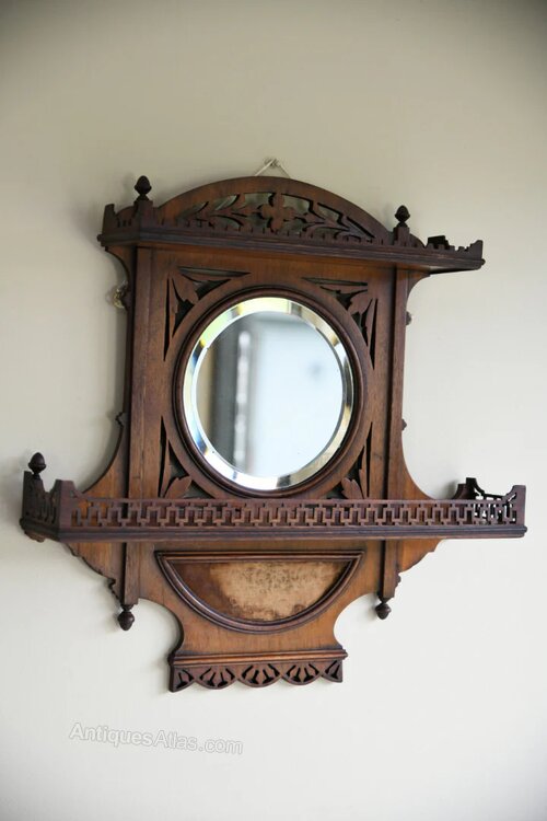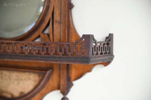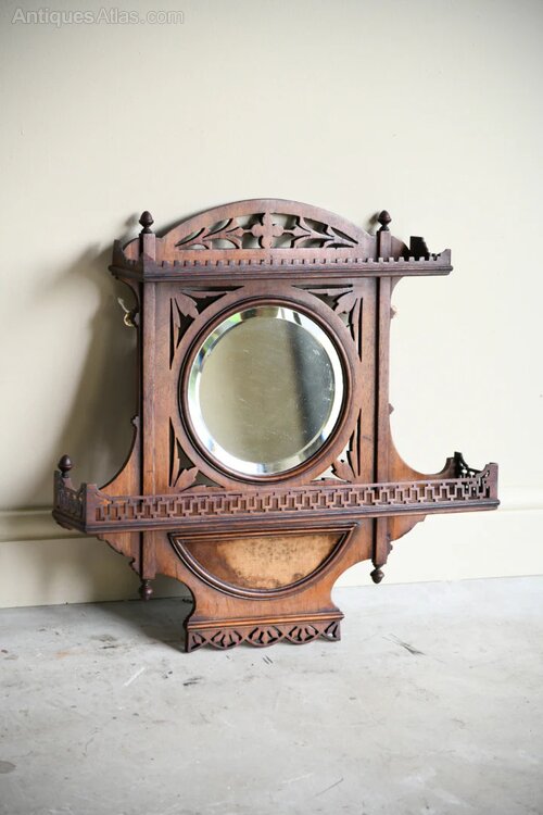 Victorian Walnut Wall Mirror. A late 19th century carved walnut wall mirror with central circular bevelled plate, within an ornate architectural frame. Incorporating a small shelf with pierced gallery and decorative carved detail throughout, in the Aesthetic Movement taste.