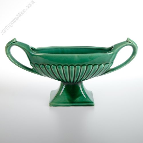 Vintage Dee Cee Emerald green ceramic trough with twin handles, the body of the vase has a raised gadrooned pattern. Made In England. Excellent Condition. H. 13cm. Vase Only. H. With Handles. 16cm. Width 7cm-19cm. Base. 8cm-10.5cm.