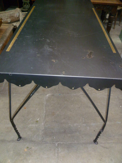 Industrial looking metal topped drapers table with brass rule down each side. Wrought iron base