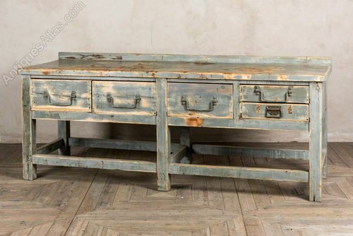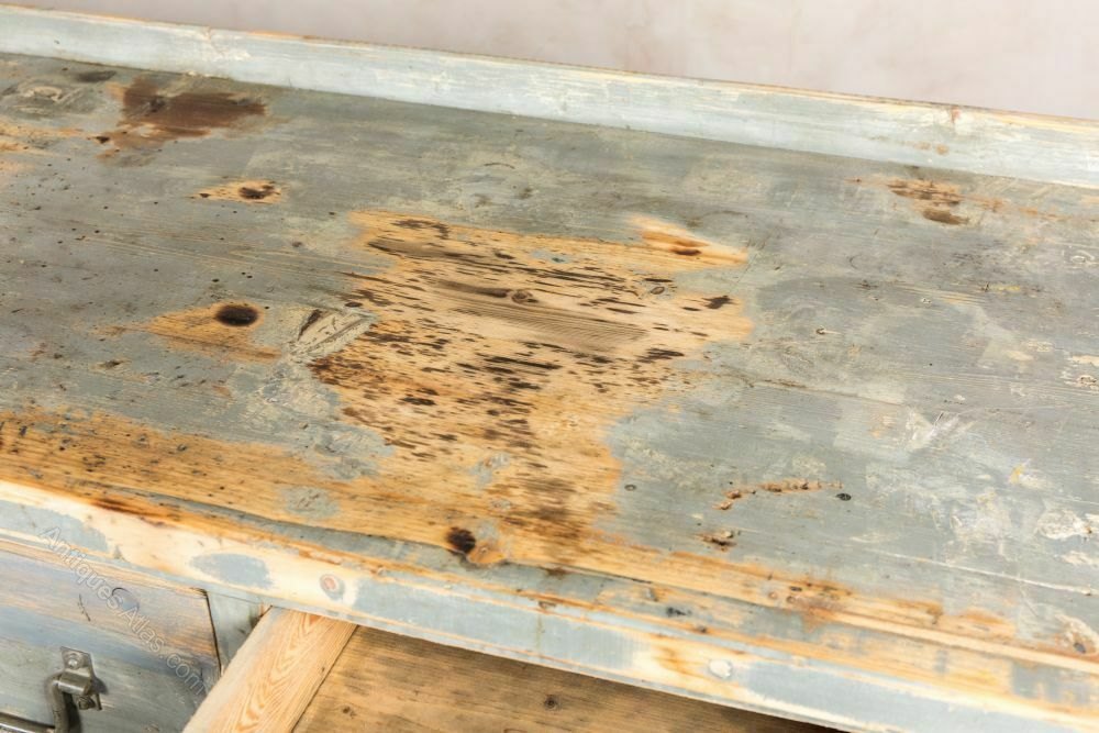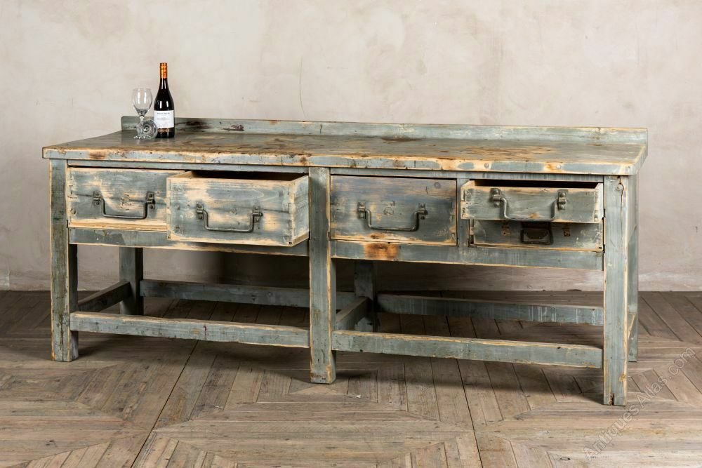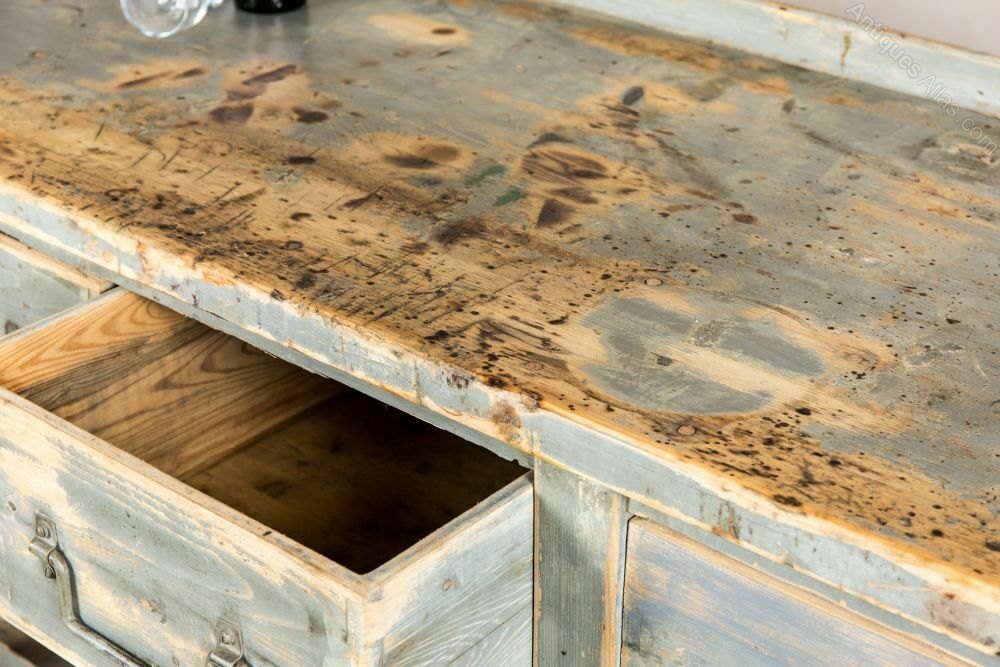 The sideboard is pine and has a distressed paint finish. The paint has worn over time, and the sideboard has scratches and knocks from many years of use. We feel that these signs of age add to its rustic character.