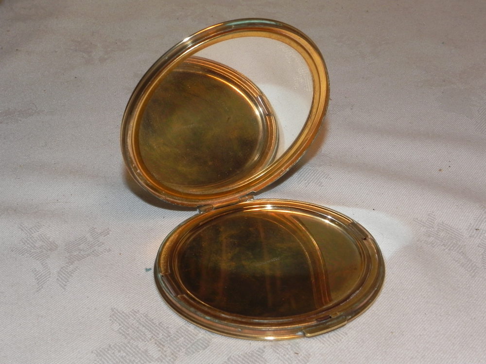 This is a rare & special find. This brass powder compact by Le Rage is in the form of a roulette wheel, the small ball continues to turn true, the enamelling to the roulette wheel is in good order. Measuring c. 3.1/4"inch diameter, impossible to find this particular piece (the first Ive seen in the flesh in over 20 years!), I know it will delight!. In super order, all clasps and hinges are in good order, opening to reveal an inner opening lid signed Le Rage. The powder well is empty and the mirror is clear - a nice piece that is a "must have" for any novelty collection - Le Rage were only manufacturing powder compacts for a very short time during the 1950's and their products are very difficult to find. This is a fine collector's book piece in good vintage order that will not disappoint