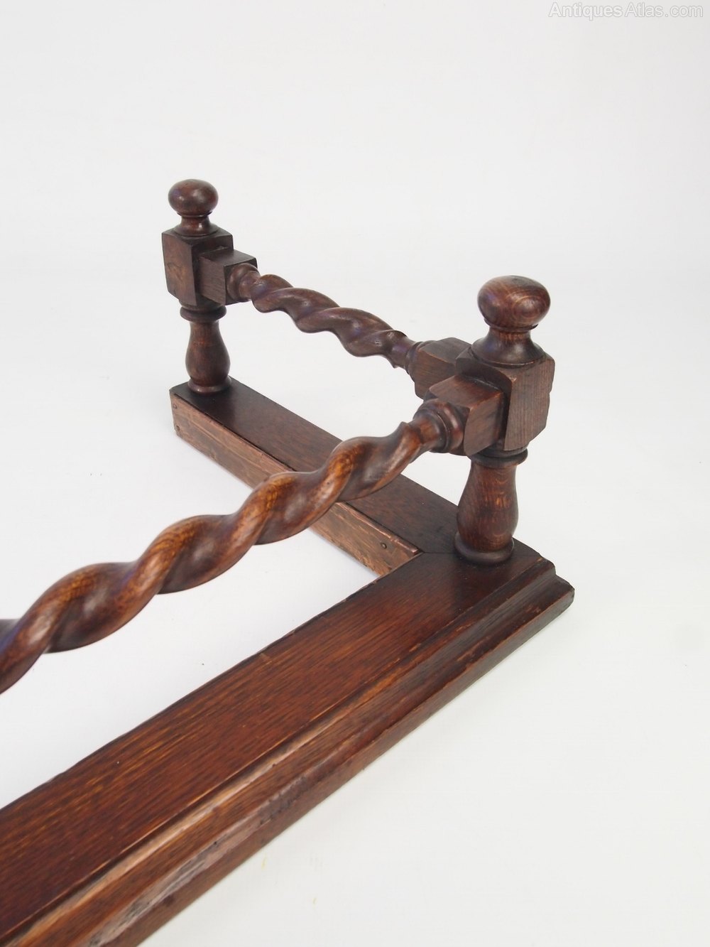 A decorative vintage oak fire fender dating from circa 1920s. With barley twist supports and stepped base in warm nicely figured oak with a copper back plate.