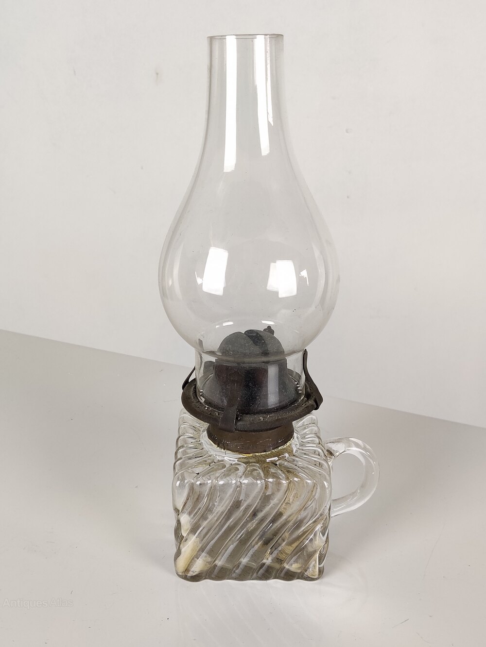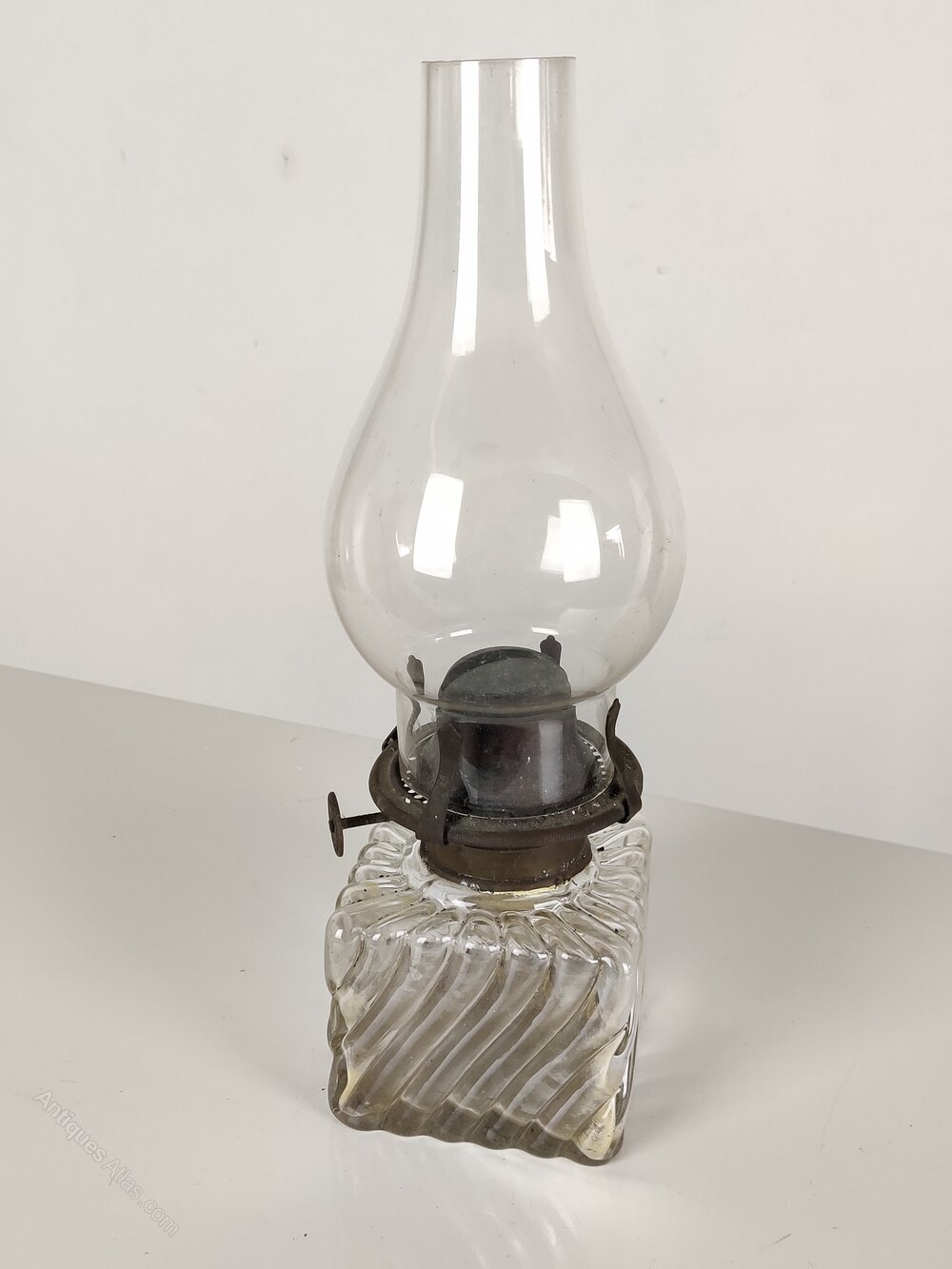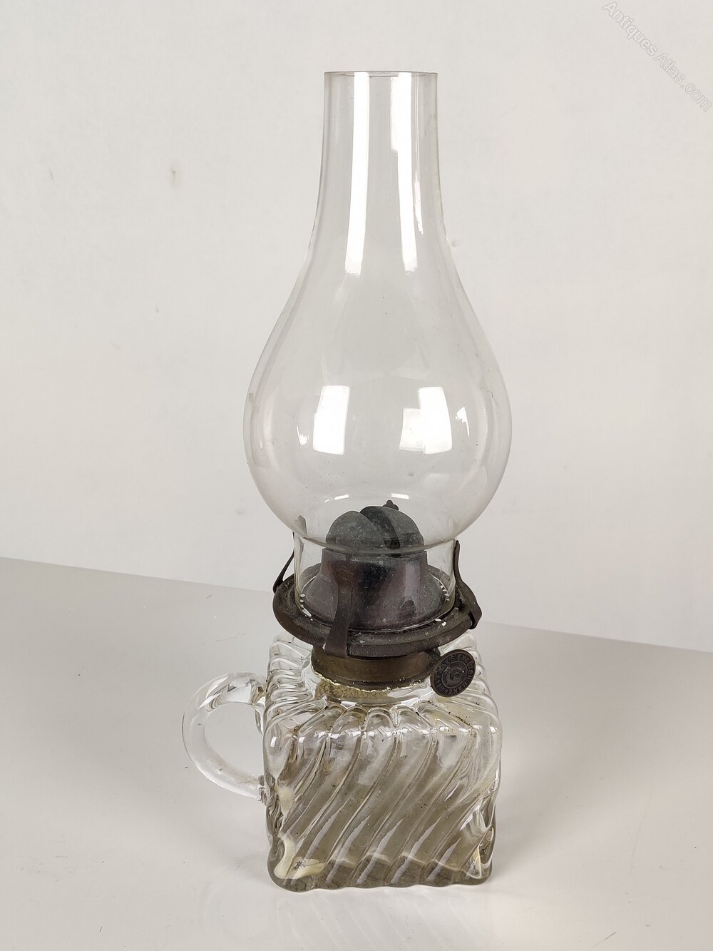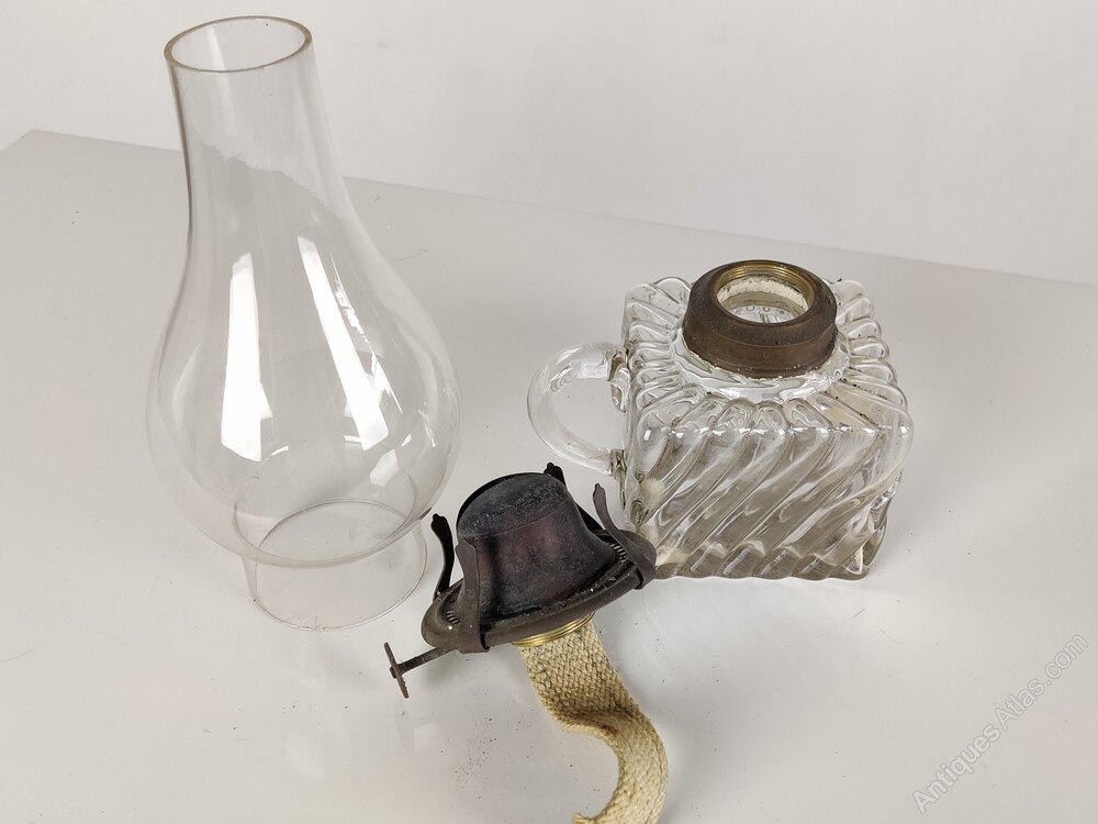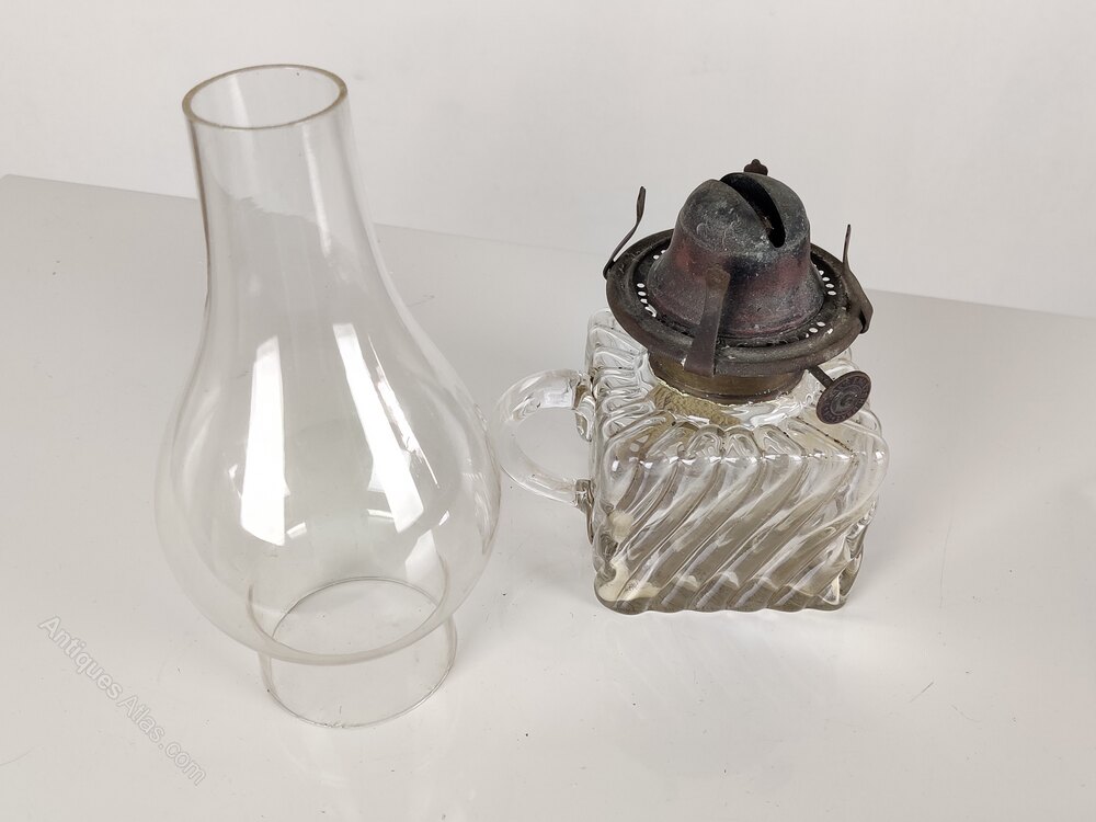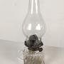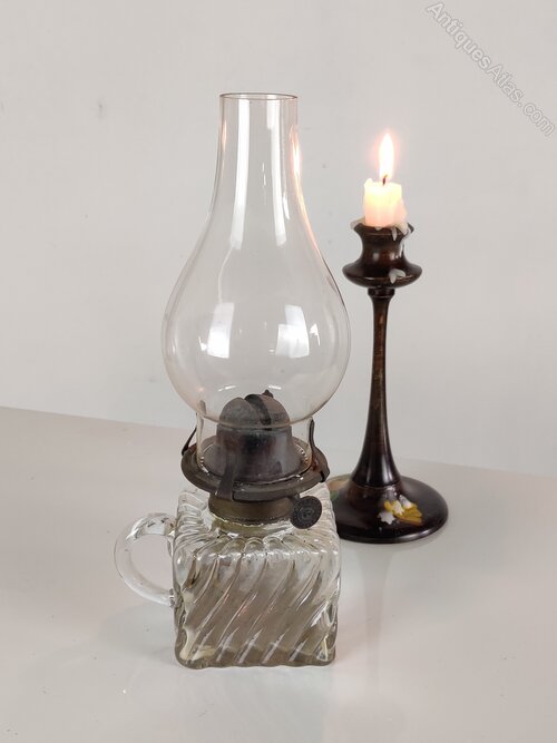 Early 20th century, with clear glass chimney and glass font/reservoir.