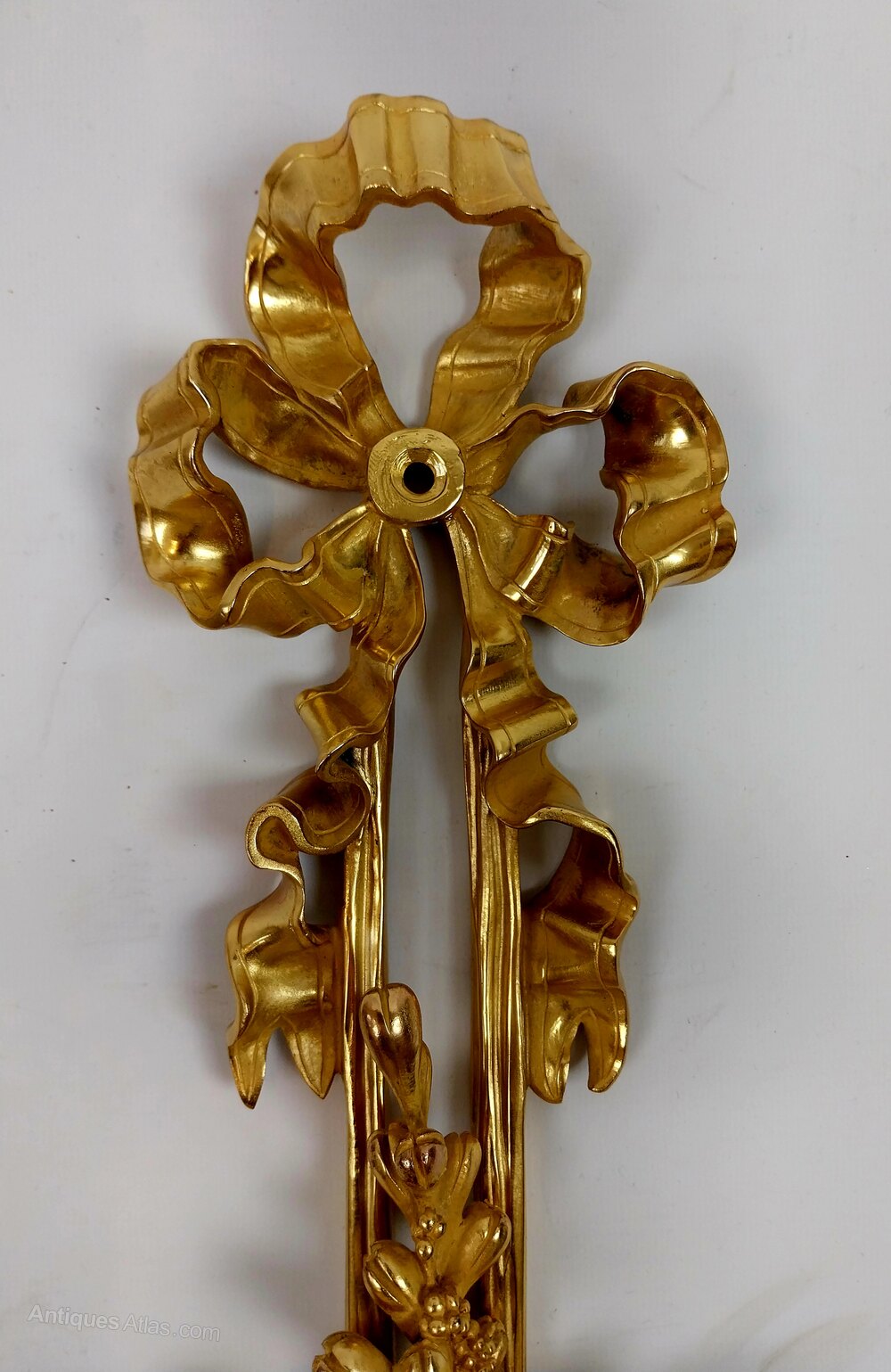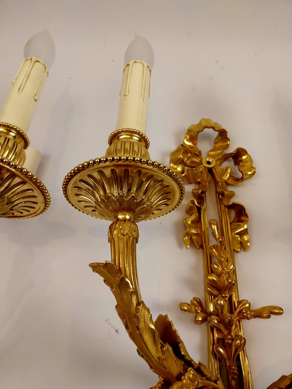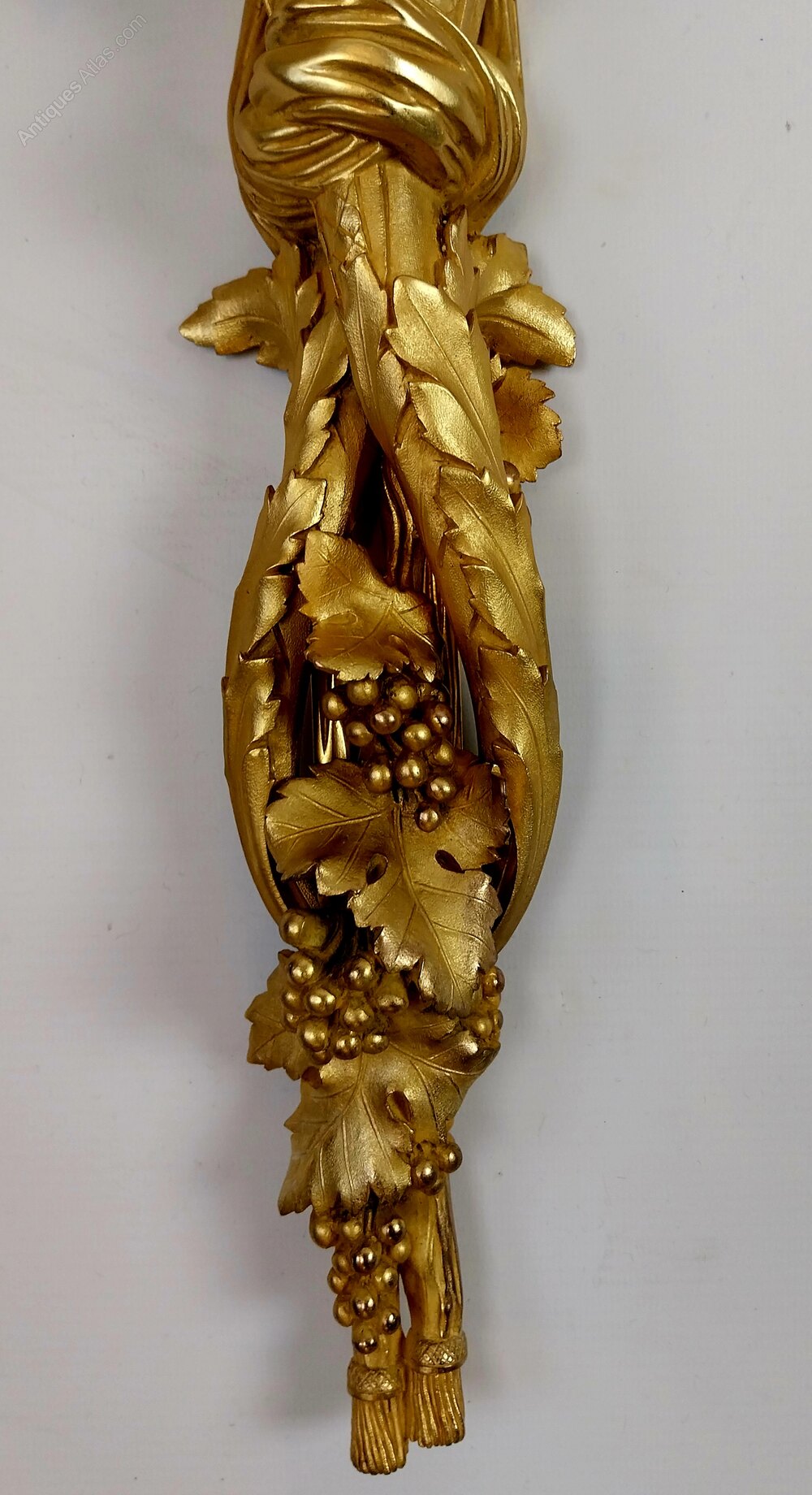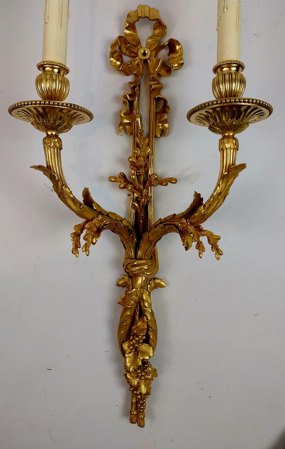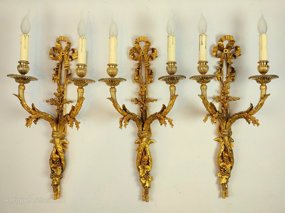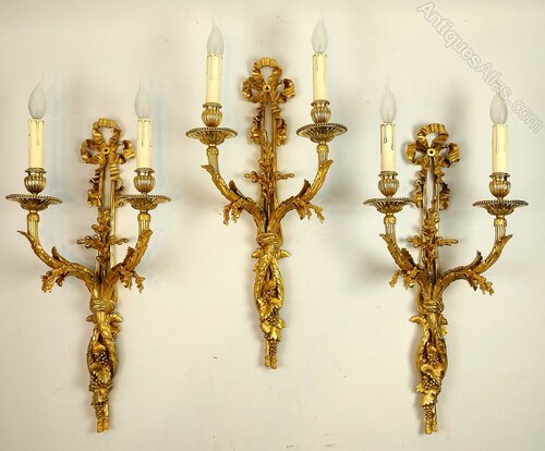 Elegant set of three large antique gilded bronze wall sconces of superb quality, richly decorated with ribbon tied tops which intertwine into scrolling foliage to the centre and finished with grapes and vine leaves trailing downwards to the base each scrolling candle arm has floral casting upwards towards the large finely cast drip trays which support each candle sconce, having finely chased ornamentation that reflects the craftsmanship that shines through out these out standing wall lights