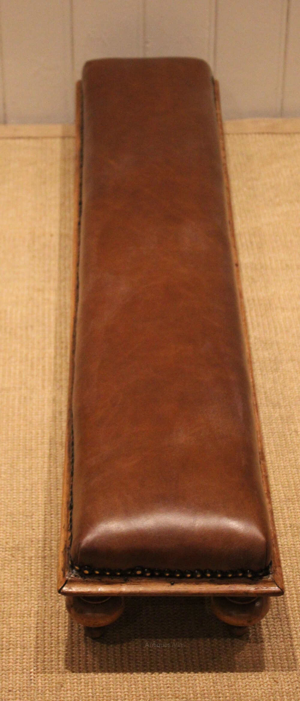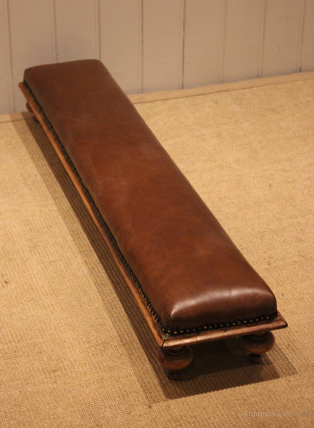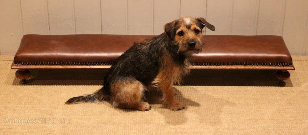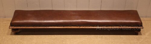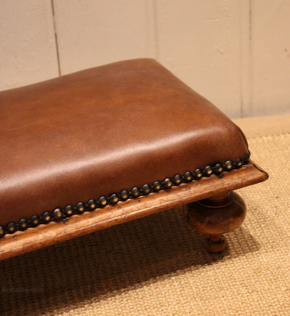 Victorian long upholstered footstool upholstered in full skin leather ,standing on four walnut shaped supports .
