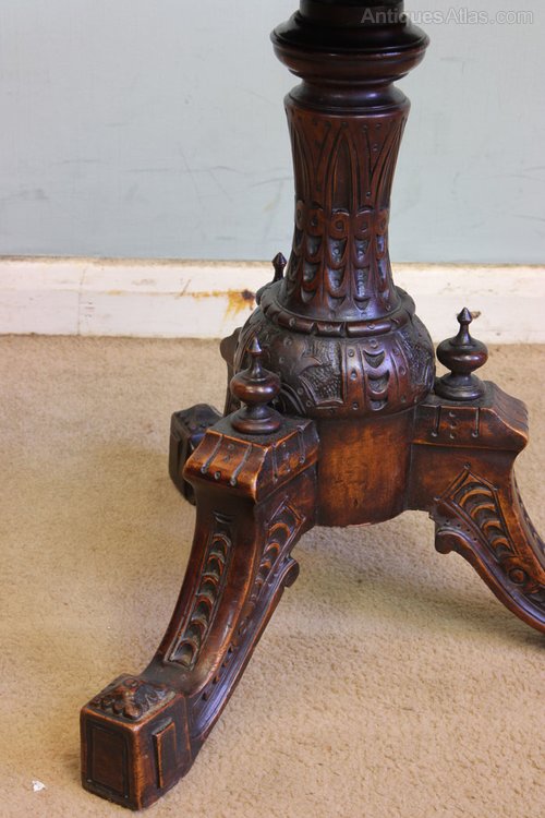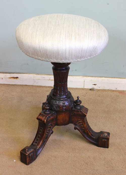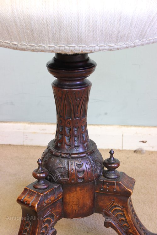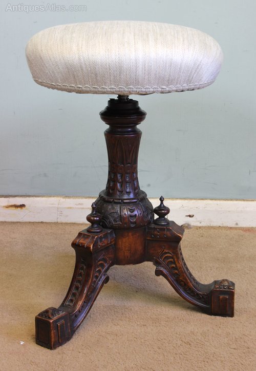 Antique Walnut Adjustable Piano Stool. This adjustable walnut piano stool has a circular padded upholstered seat and is supported by a carved centre column and three carved legs with finials.