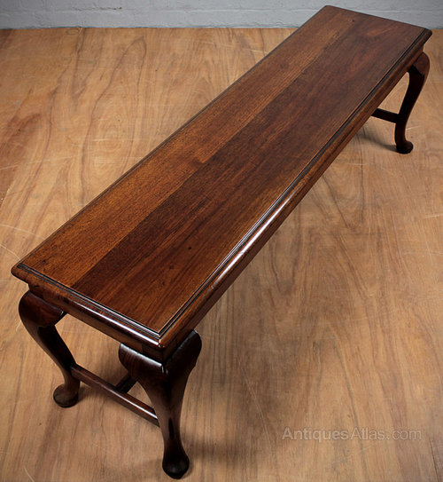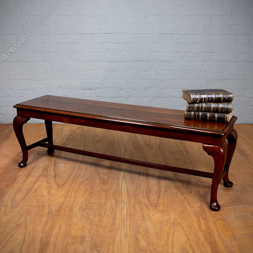 Late 19th.c. walnut long stool or bench c.1890. Solid top with molded edge on shaped cabriole legs with a stretchers between for extra strength. Original maker’s label to the underside from Tebbit of Birmingham. Excellent condition, cleaned and polished in our workshops.