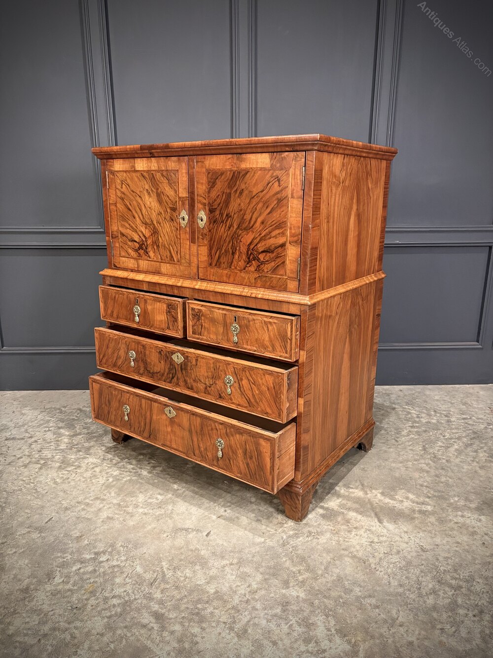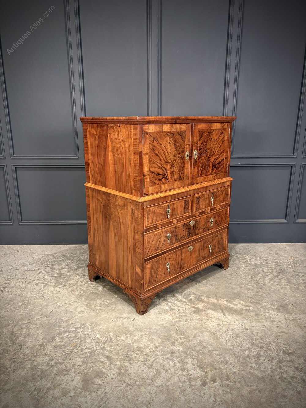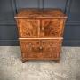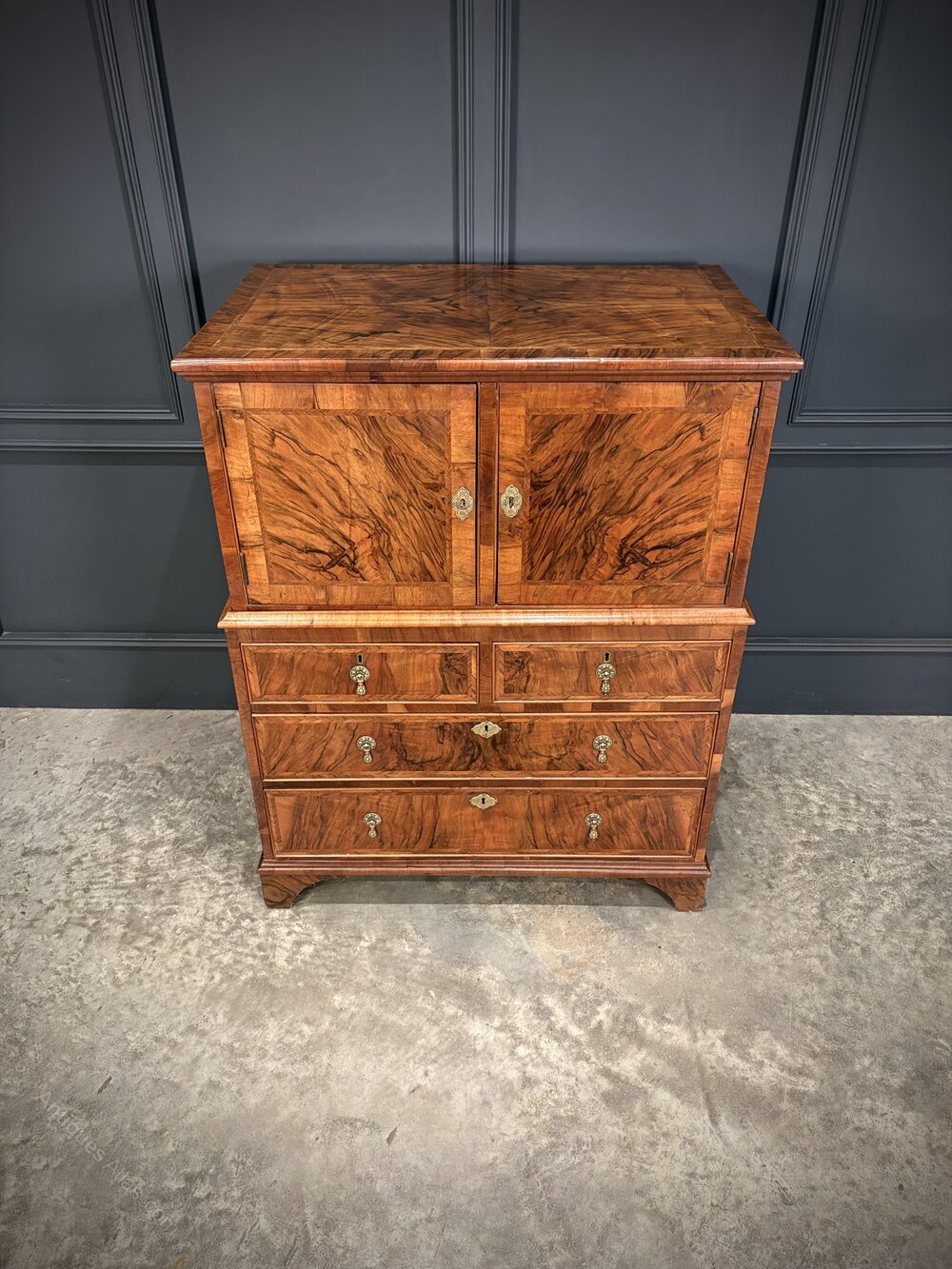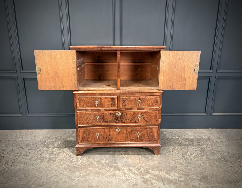 The upper cabinet features 2 doors boasting a beautifully figured walnut, with a split interior (left and right compartments), complete with working locks and keys.