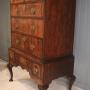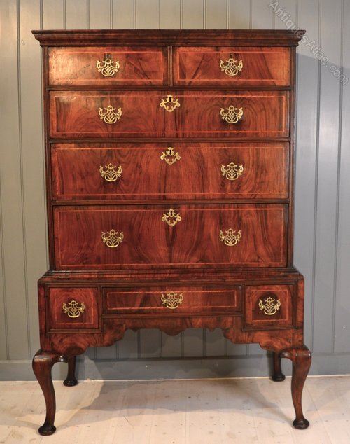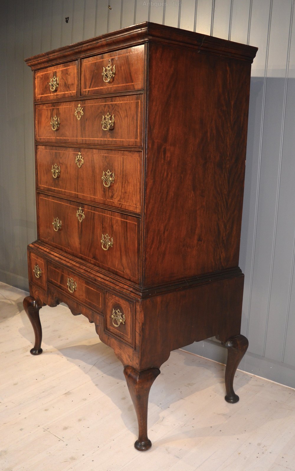 Beautifully constructed 18th century walnut chest on stand with figured walnut veneer on the drawer fronts and elm inlaid stringing.